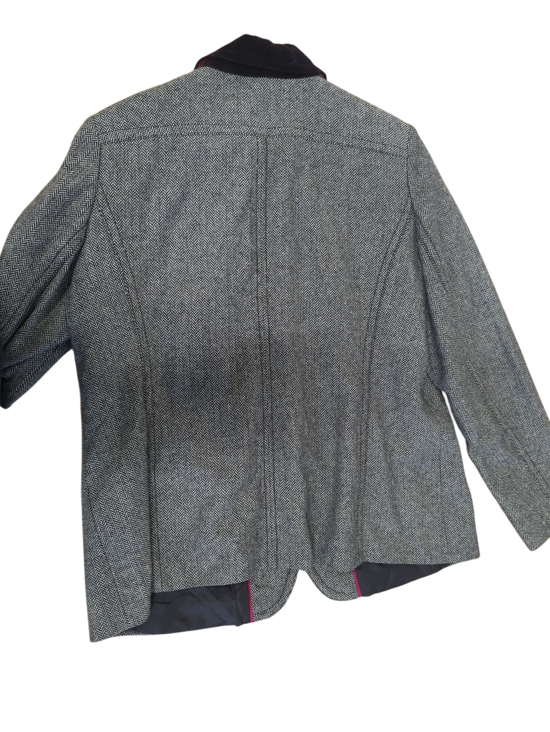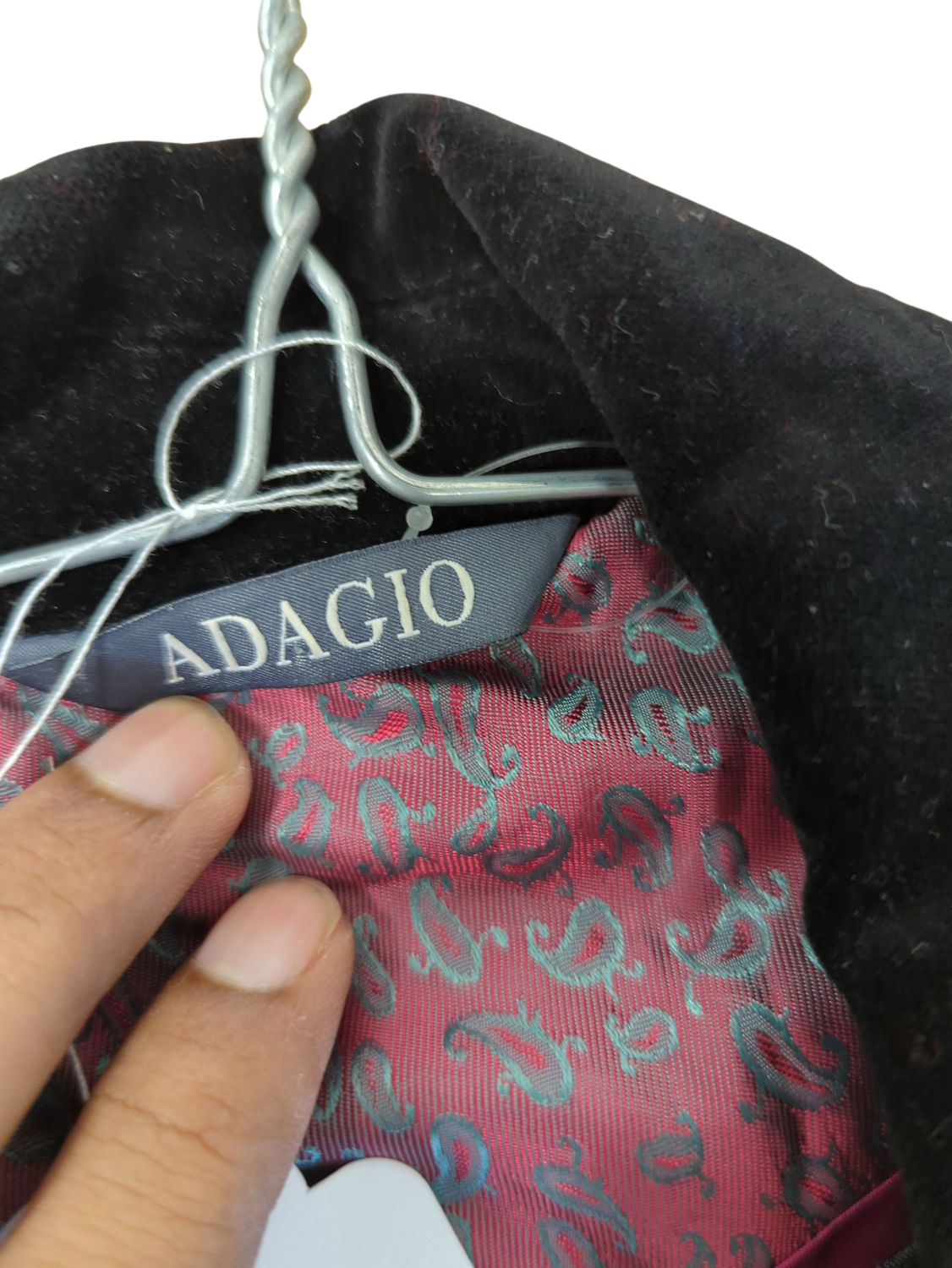 This is a grey patterned blazer jacket from ADAGIO, featuring a classic long sleeve design and a black velvet collar. The interior has a paisley patterned lining. Ideal for formal or smart casual occasions. Size and material details are not visible in the images. The item is in used condition.