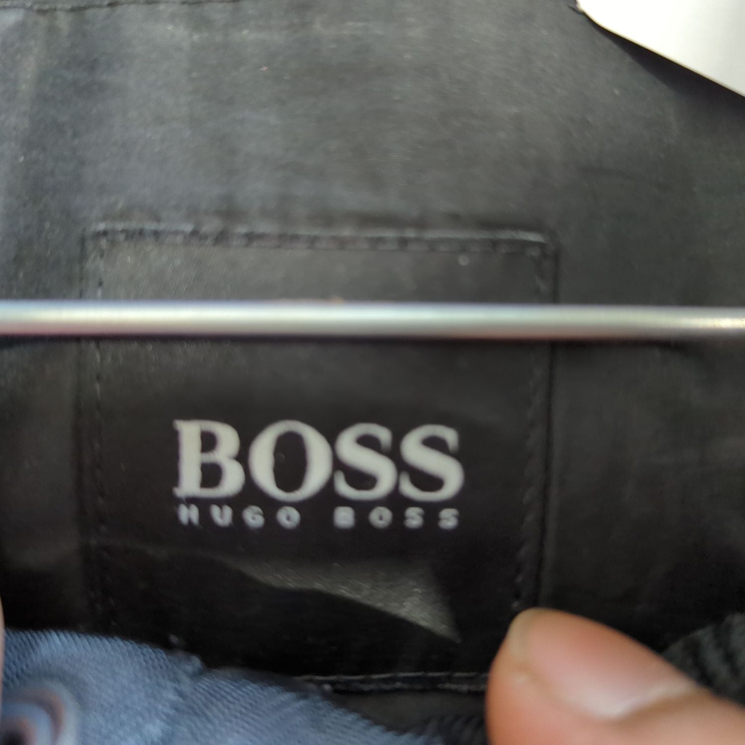 This is a used black jacket from BOSS Hugo Boss. The jacket features a classic design with a collar, front button closure, and multiple pockets. Made with quality construction typical of the BOSS brand, this jacket offers a sleek, professional appearance. The garment appears to be in used condition. Please note that size information is not visible in the images provided.