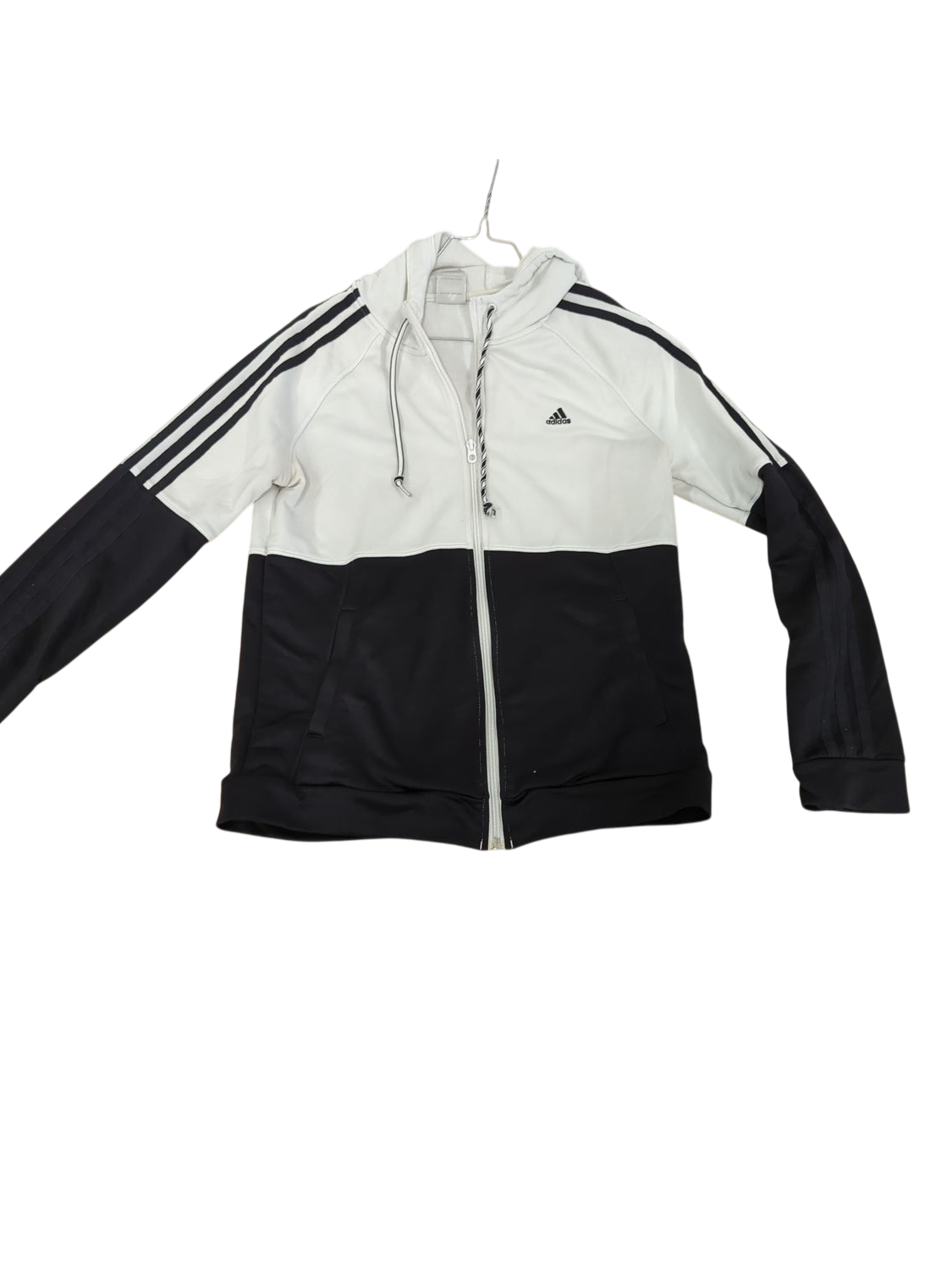 Adidas track jacket in a classic black and white color combination. The jacket features a full-length front zipper, side pockets, and the iconic three stripes detail on the sleeves. The upper portion is white while the bottom is black, creating a two-tone design. It has a hood and is made from lightweight material, making it perfect for sports activities or casual wear. The jacket is size Medium (UK 12-14) and shows some signs of regular wear but remains in good usable condition.