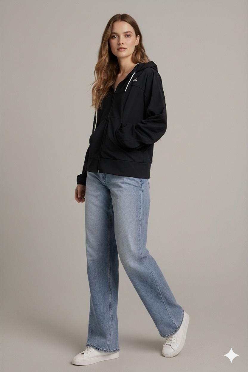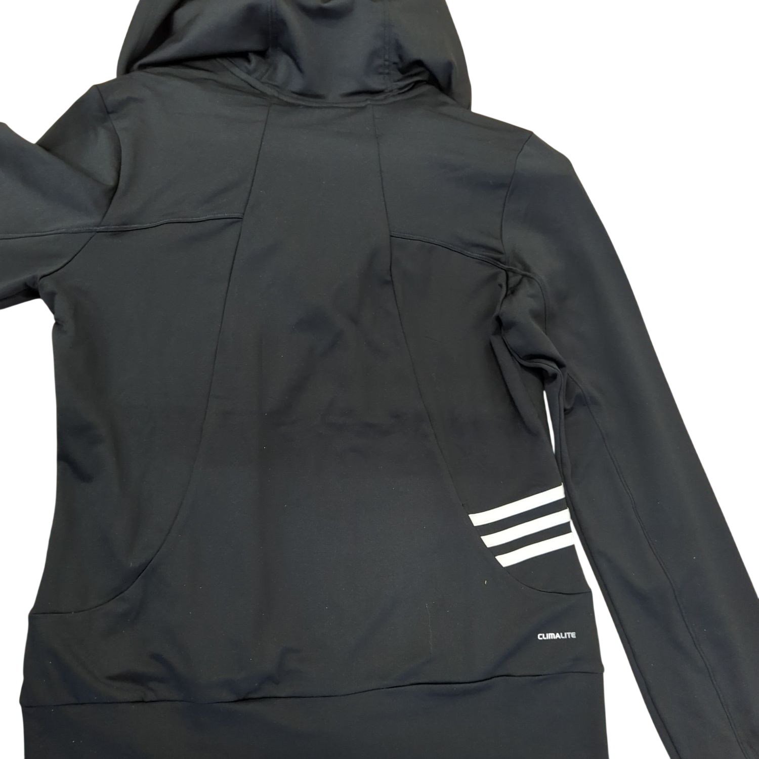 Black Adidas track jacket in size M. Features the iconic three white stripes on the shoulders and the Adidas logo. Full front zipper closure with two side pockets. Made from lightweight material that's perfect for sports and casual wear. This jacket has a classic athletic design with the Climacool technology. Slightly used but still in good condition.