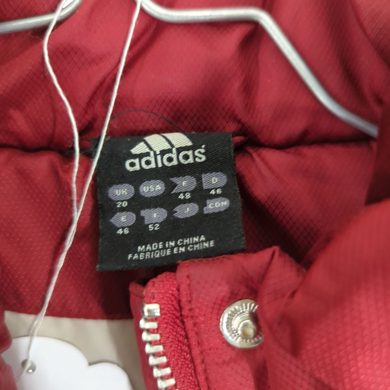 This burgundy Adidas padded vest is perfect for layering during cooler weather. Features a full-length front zipper closure, stand-up collar for added warmth, and the classic Adidas logo on the chest. The quilted design provides excellent insulation while the sleeveless style allows for freedom of movement. Size 52, made in China. Shows some signs of wear consistent with pre-owned condition, but still has plenty of life left. Ideal for casual outings or active days when you need an extra layer without bulk.