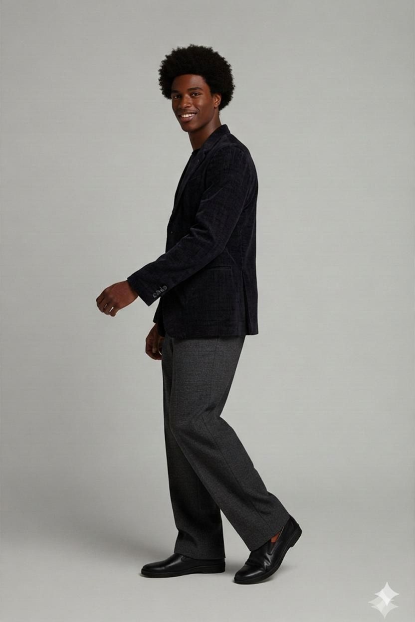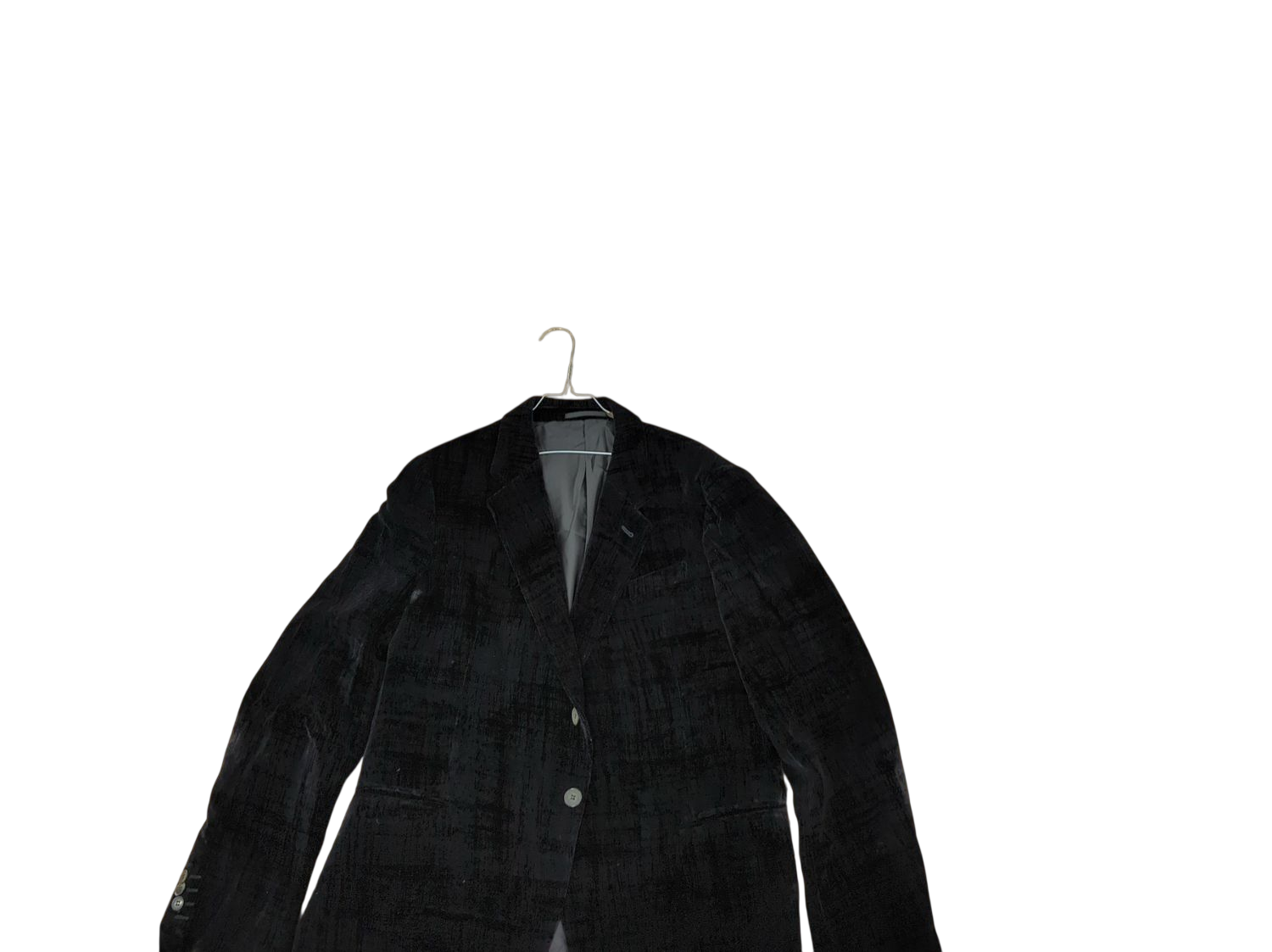 This black velvet blazer from Armani Collezione features a classic design with a notched lapel and two-button closure. The jacket has a sophisticated gray lining and is made in Italy. It's size 56/R (European sizing) and shows minimal signs of wear. The blazer has three buttons on each sleeve cuff and features the distinctive Armani quality craftsmanship. Perfect for formal occasions or elegant evening events.
