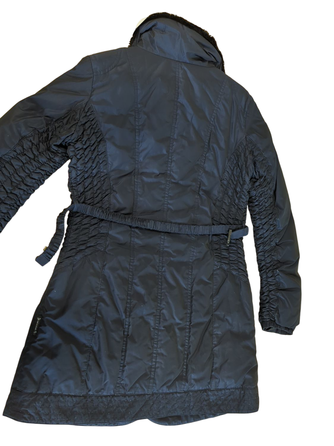 This Armani Jeans navy parka features a plush faux fur collar and a flattering silhouette with a belted waist. The coat has distinctive quilted detailing on the sleeves and hem, along with practical front zip closure. Size 42/6 (European/US sizing). The jacket is in used condition and includes the original Armani Jeans branded label. Perfect for staying stylish during colder weather with its combination of fashion and functionality.