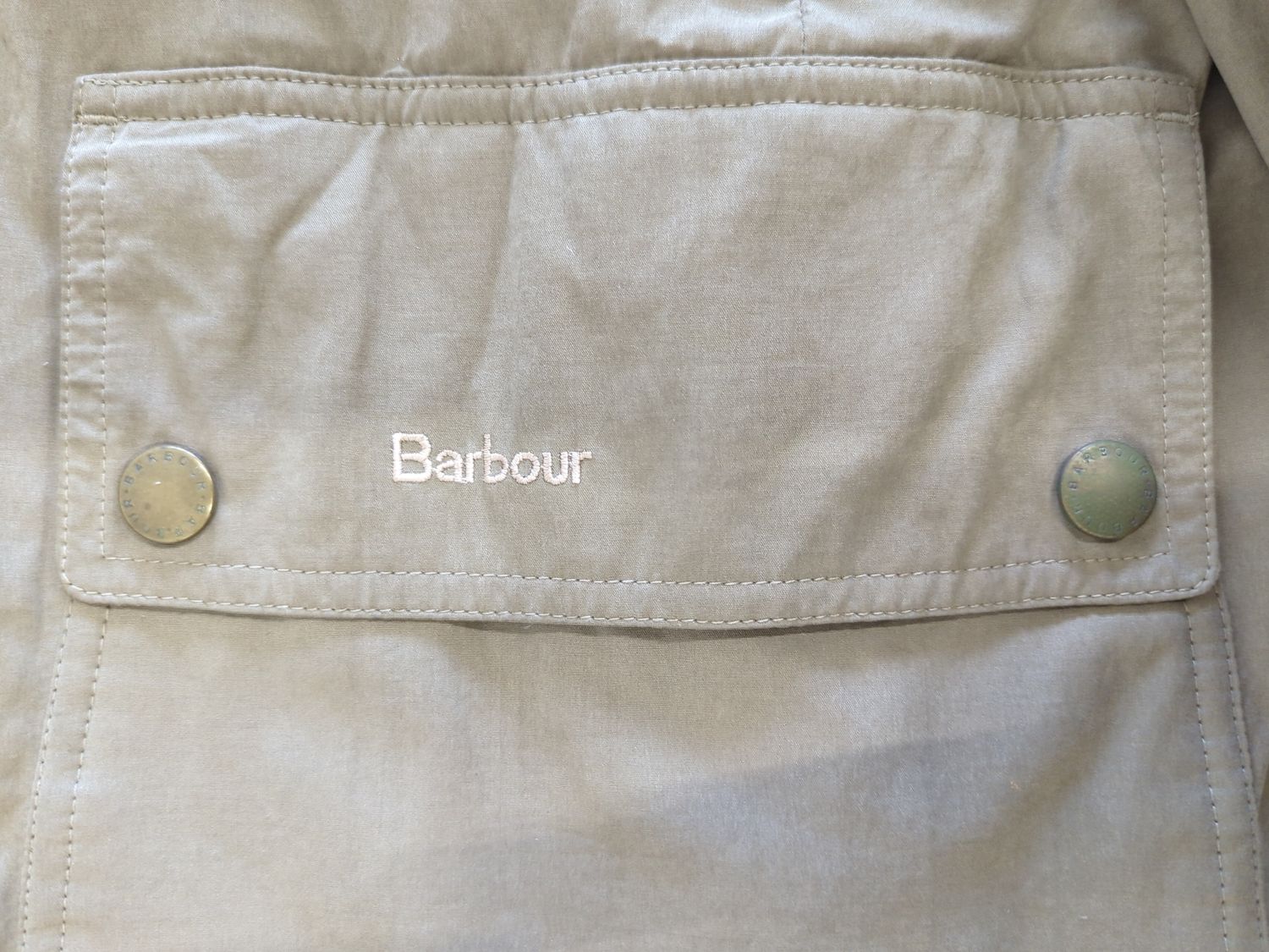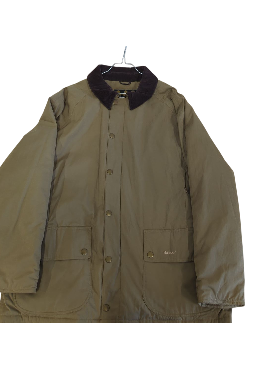 Authentic Barbour men's parka jacket in beige/khaki color, size XL. This classic outdoor jacket features the signature Barbour branding on both the label and chest pocket. The jacket has multiple pockets with button closures, a full front button fastening, and a corduroy collar detail for added comfort and style. Made with Barbour's renowned quality craftsmanship, this jacket is perfect for outdoor activities and everyday wear. Shows some signs of use but remains in good condition overall.