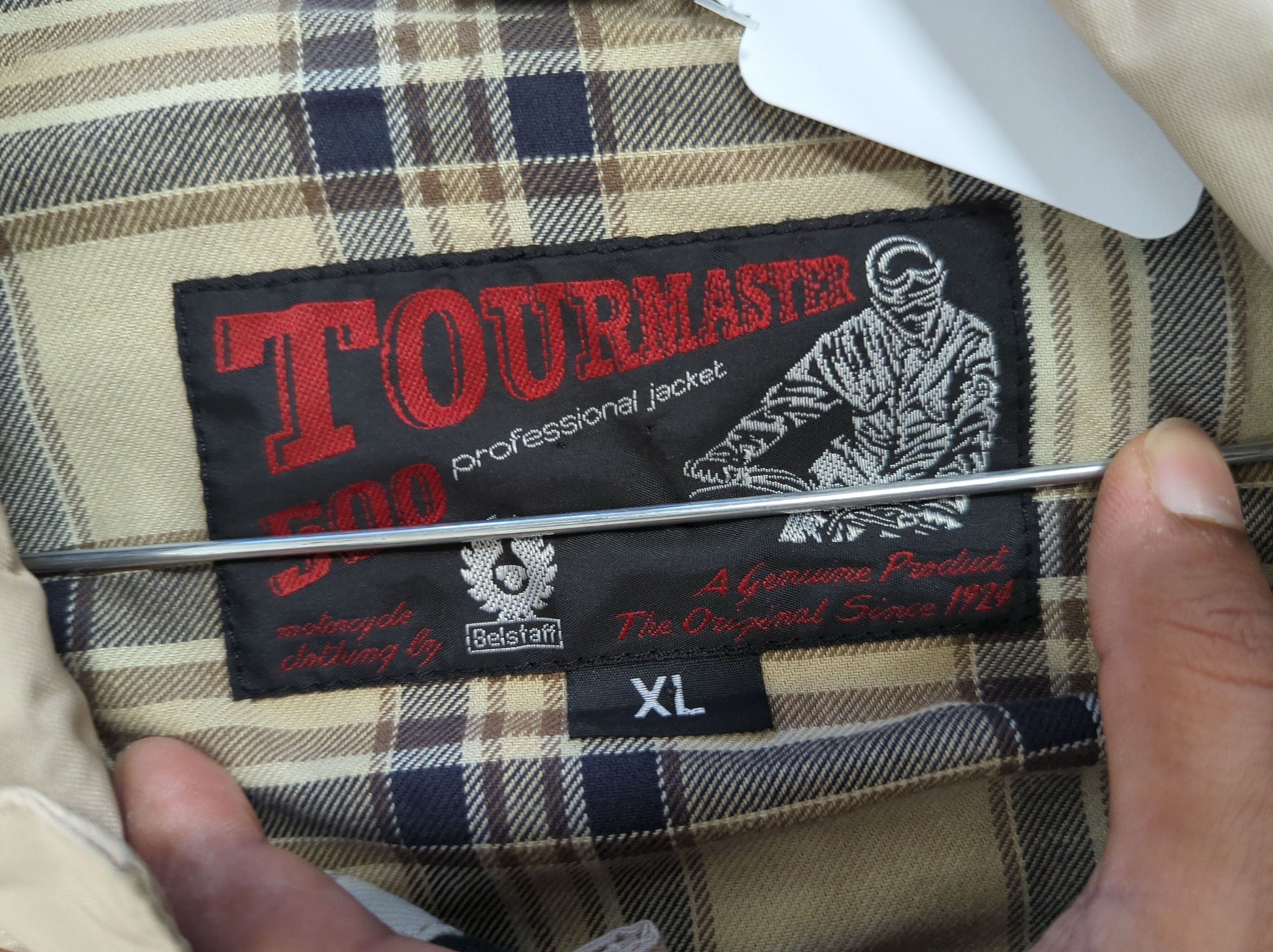 Belstaff men's windbreaker jacket in a light beige/tan color. Size XL. Features multiple front pockets with snap closures, classic collar, and full button front closure. The jacket has a classic design with the signature Belstaff quality, and includes a plaid pattern lining. Shows some signs of wear consistent with pre-owned condition. Perfect for casual everyday wear or outdoor activities in mild weather.