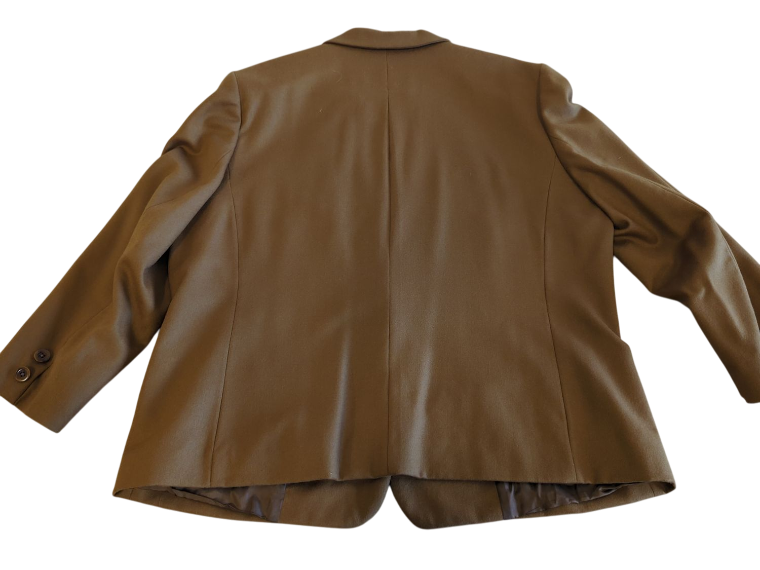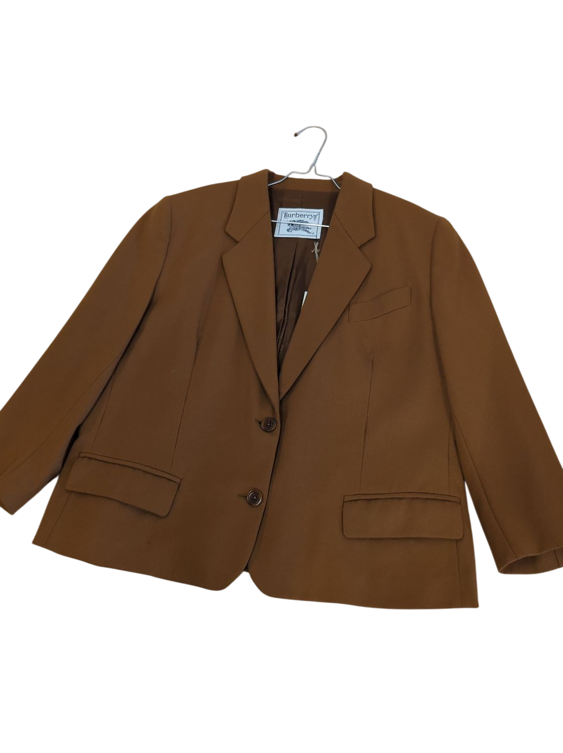 This pre-owned Burberrys brown blazer features classic tailoring with notched lapels and a two-button front closure. Made from what appears to be a wool blend fabric, the jacket has a timeless design with front flap pockets and functional buttoned cuffs. The blazer has a fully lined interior and shows the authentic Burberrys label. This versatile piece would make an excellent addition to a professional wardrobe or could be styled more casually. Please note that there are no size tags visible in the images.