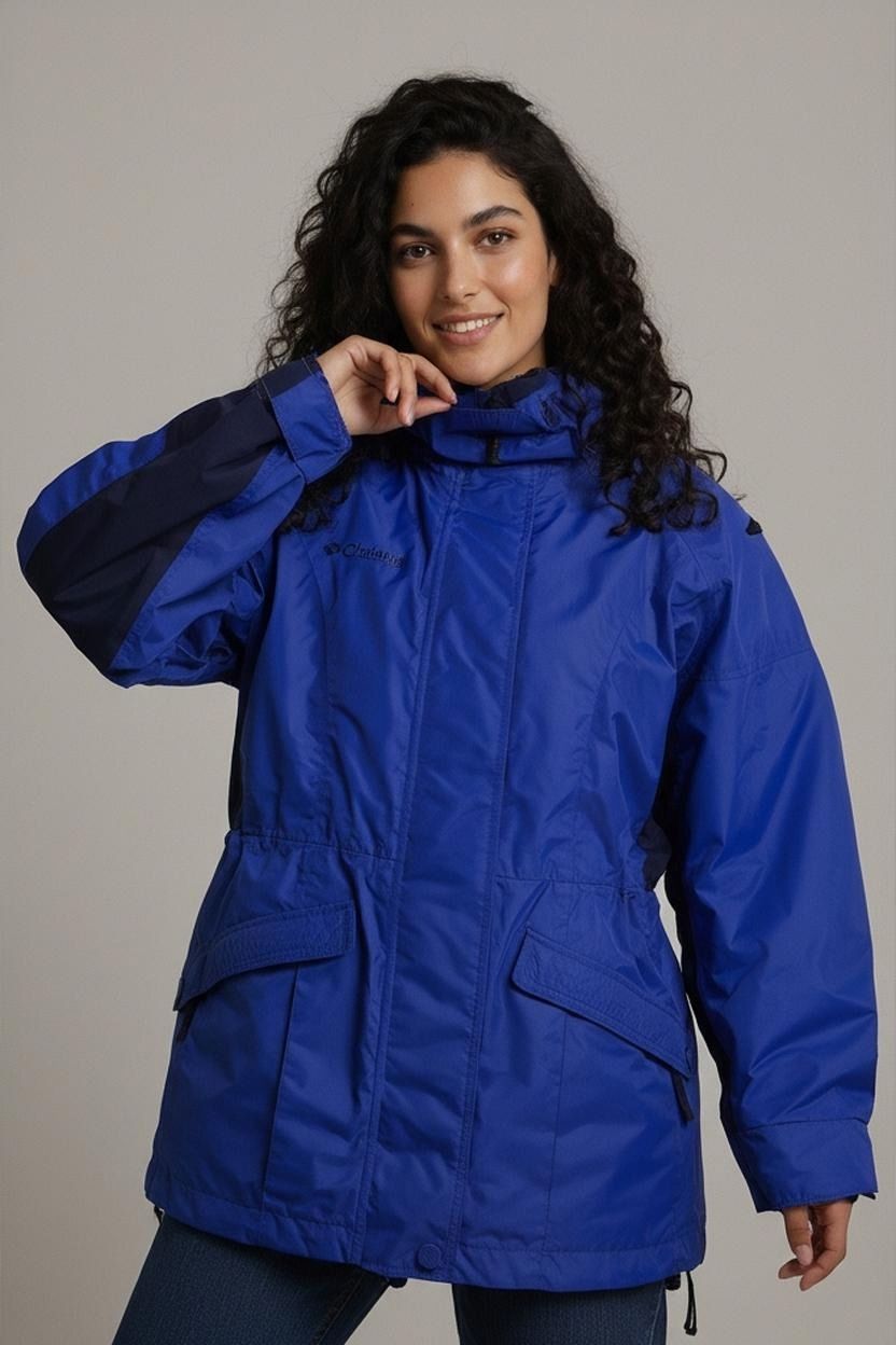 Columbia Sportswear windbreaker jacket in a vibrant blue color with navy accents. Size L (Large). This lightweight jacket features an adjustable waistband for a better fit and full front zip closure. The jacket has the Columbia logo embroidered on the chest. Made in China. Perfect for outdoor activities, light hiking, or casual everyday wear. Shows some signs of normal use but remains in good functional condition.