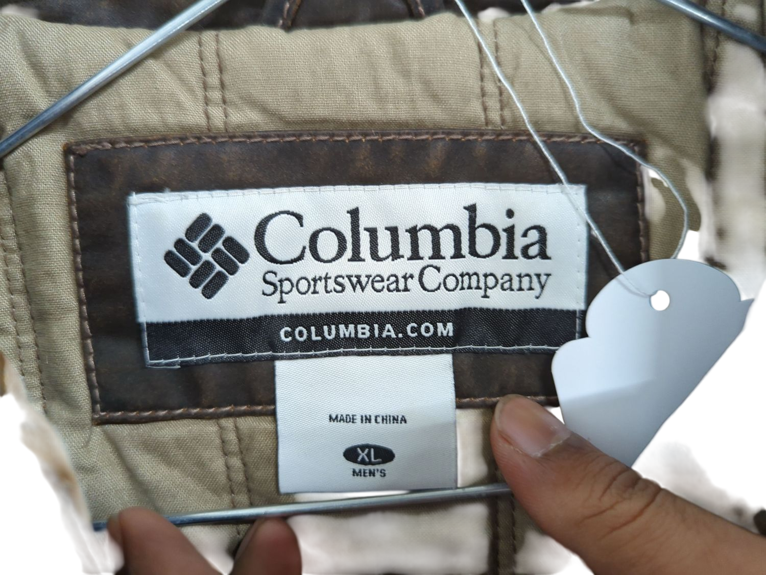 This is a pre-owned Columbia Sportswear jacket in brown cotton material. The jacket features a front zip closure, side pockets with flaps, and adjustable buckles at the waist. It has a classic collar and the Columbia brand logo on the interior tag. The jacket shows signs of wear consistent with its used condition but remains functional and durable for everyday use. Size XL, made in China. Perfect for casual outings or light outdoor activities.
