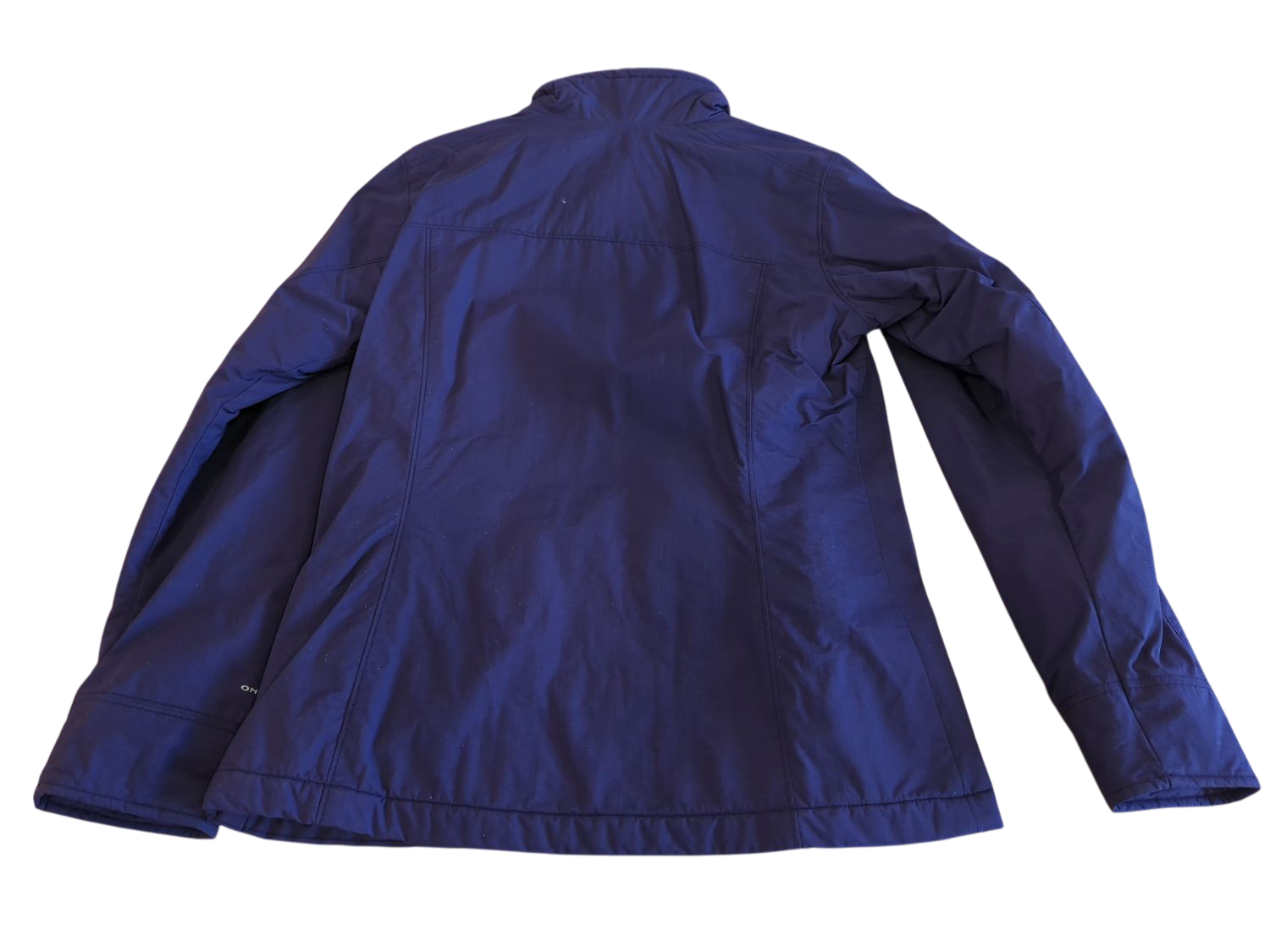 This Columbia Sportswear windbreaker jacket in a deep purple/navy color is perfect for outdoor activities. The jacket features a full front zipper closure, stand-up collar, and two front pockets with snap closures. Made from a durable synthetic material, it offers protection against wind and light rain. The jacket is size Medium and shows signs of normal wear. Columbia's quality craftsmanship ensures this piece will be functional for various outdoor activities.