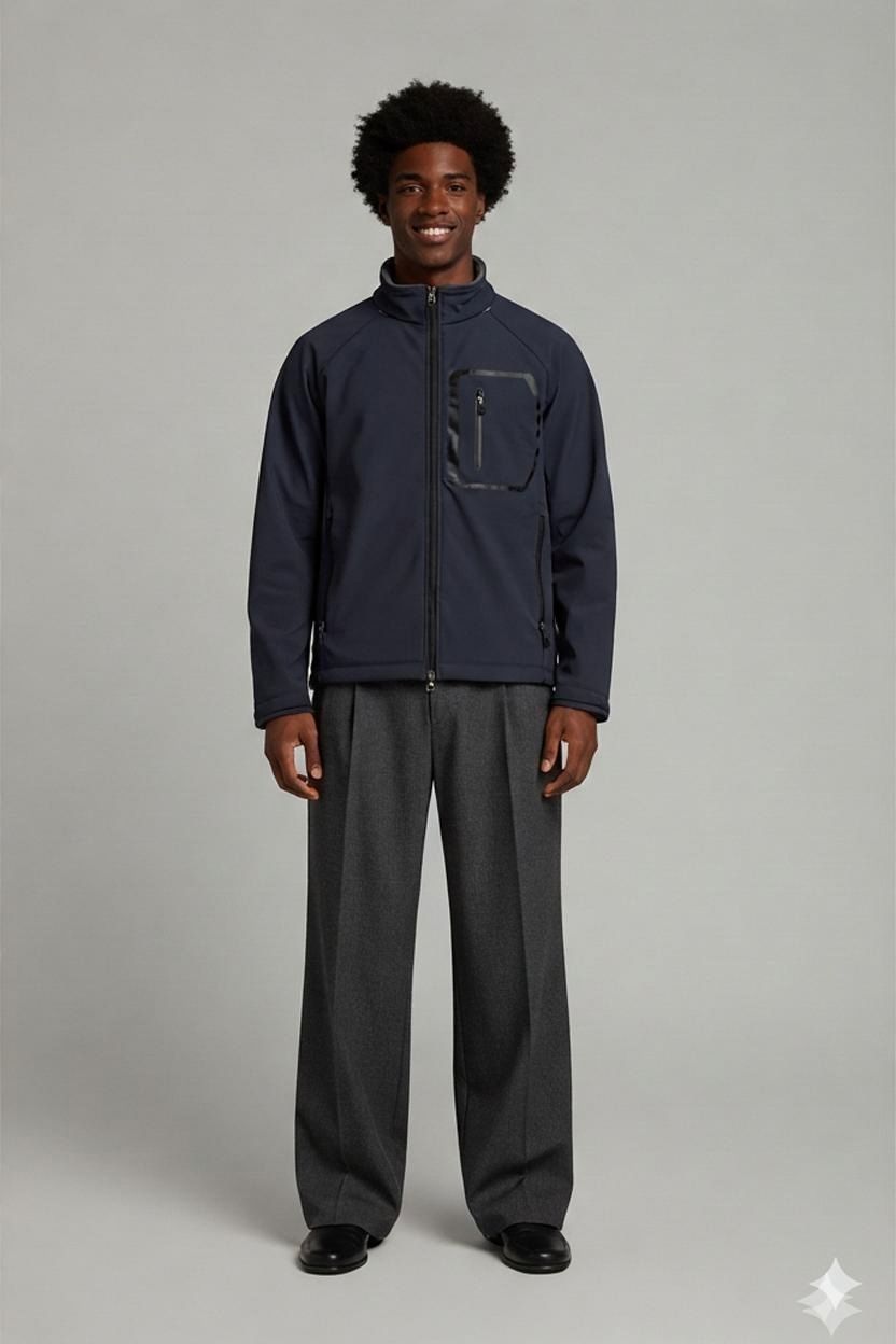 Columbia Titanium softshell jacket in grey/charcoal color. Men's size L. Features a full front zipper, stand-up collar, and multiple zippered pockets including a chest pocket with waterproof zipper. The jacket is made of durable softshell material with stretchy properties for comfortable movement during outdoor activities. Columbia's Titanium line represents their higher-end performance wear designed for outdoor adventures. Shows signs of normal wear but remains in good functional condition.