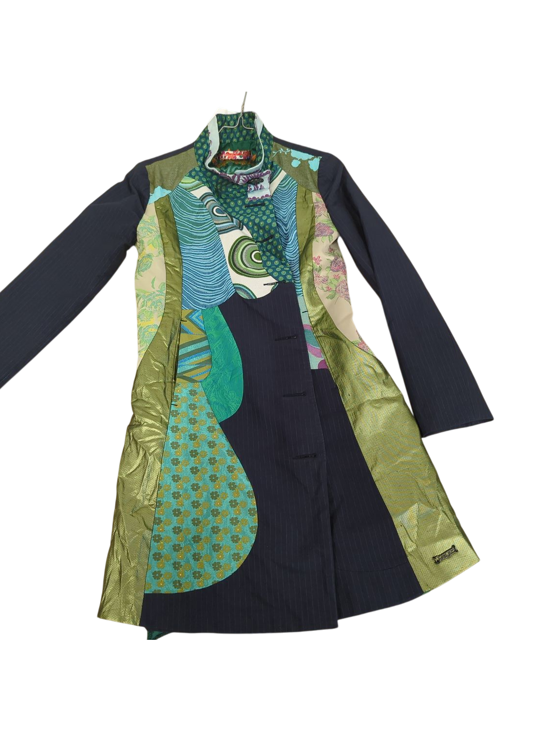 This is a distinctive Desigual jacket featuring a navy blue pinstriped exterior with vibrant green, blue, and turquoise patterned accents. The jacket has long sleeves and appears to be a structured design with decorative inner lining showcasing multiple colorful patterns and prints. The interior features an array of floral, geometric, and abstract designs in greens, blues, and pops of orange and pink. The Desigual logo is visible on the exterior. This piece combines classic navy with the brand's signature eclectic patterning for a truly unique look.