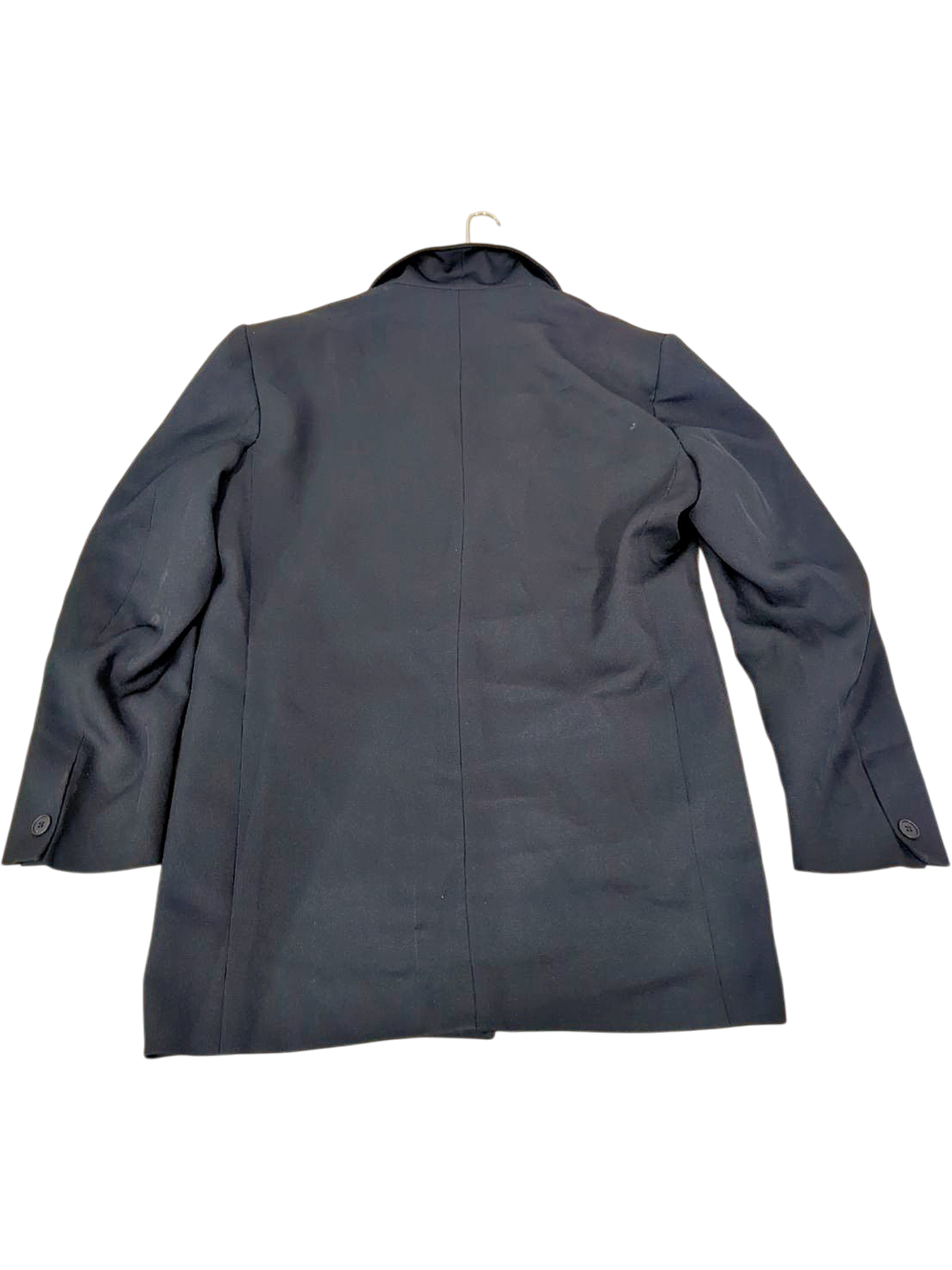 Black wool blend coat by Ettore Pancaldi. Size 52 (European sizing). Features a classic design with notched lapel collar, front pockets, and button closure. The coat has some visible signs of wear including light stains and marks on the fabric as shown in the photos. The lining appears to be in decent condition. This is a versatile piece suitable for formal and business occasions. Made by the Italian brand Ettore Pancaldi by Luigi Orefice.