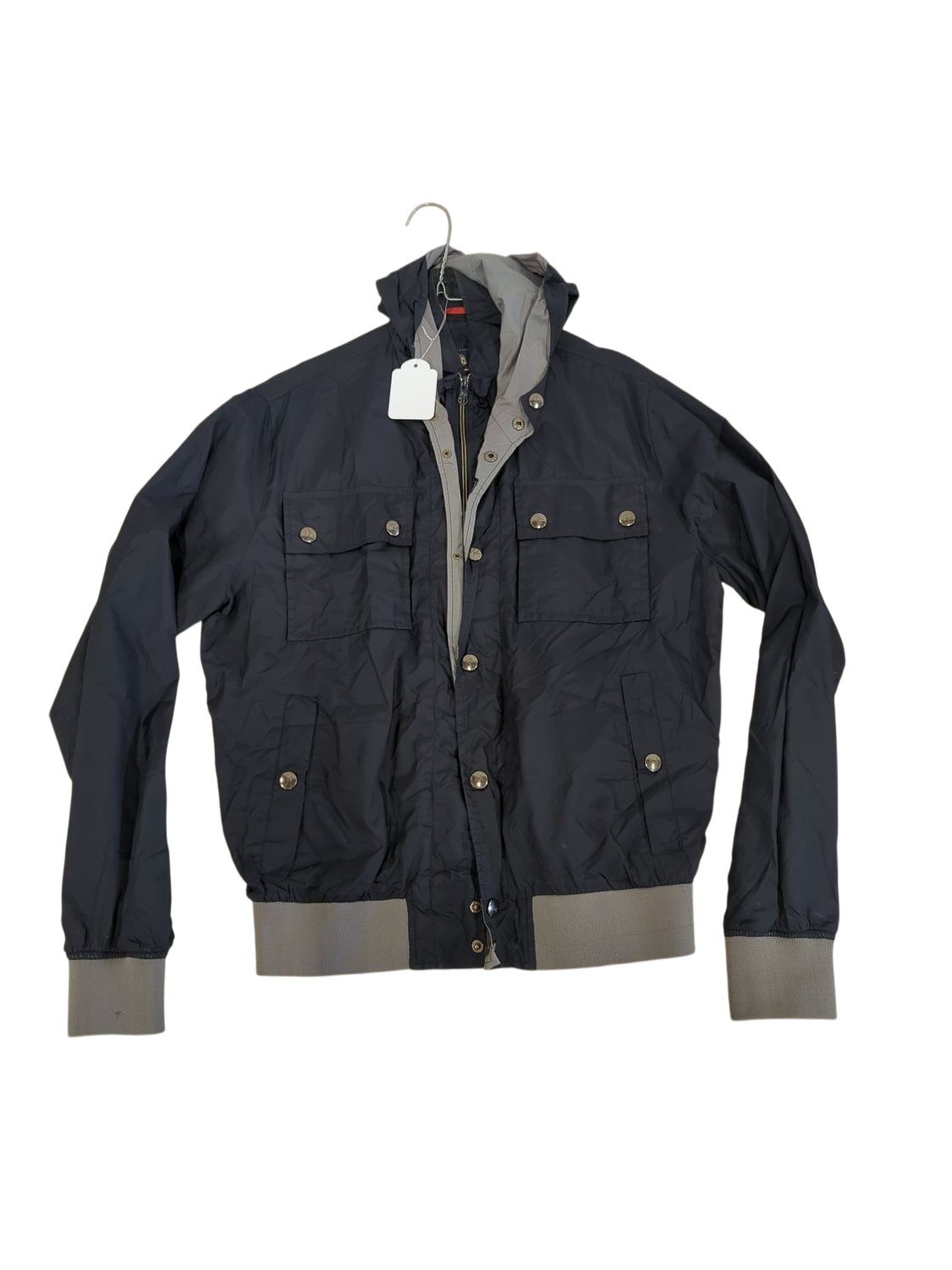 This Fay navy blue parka jacket features a practical design with multiple front pockets secured by snap buttons. The jacket has grey trim details on the cuffs and collar, adding a subtle contrast to the navy blue exterior. It closes with a full-length zipper and snap buttons for extra protection against the elements. The jacket is size L and shows signs of normal wear. This versatile piece is perfect for casual everyday wear during cooler weather.