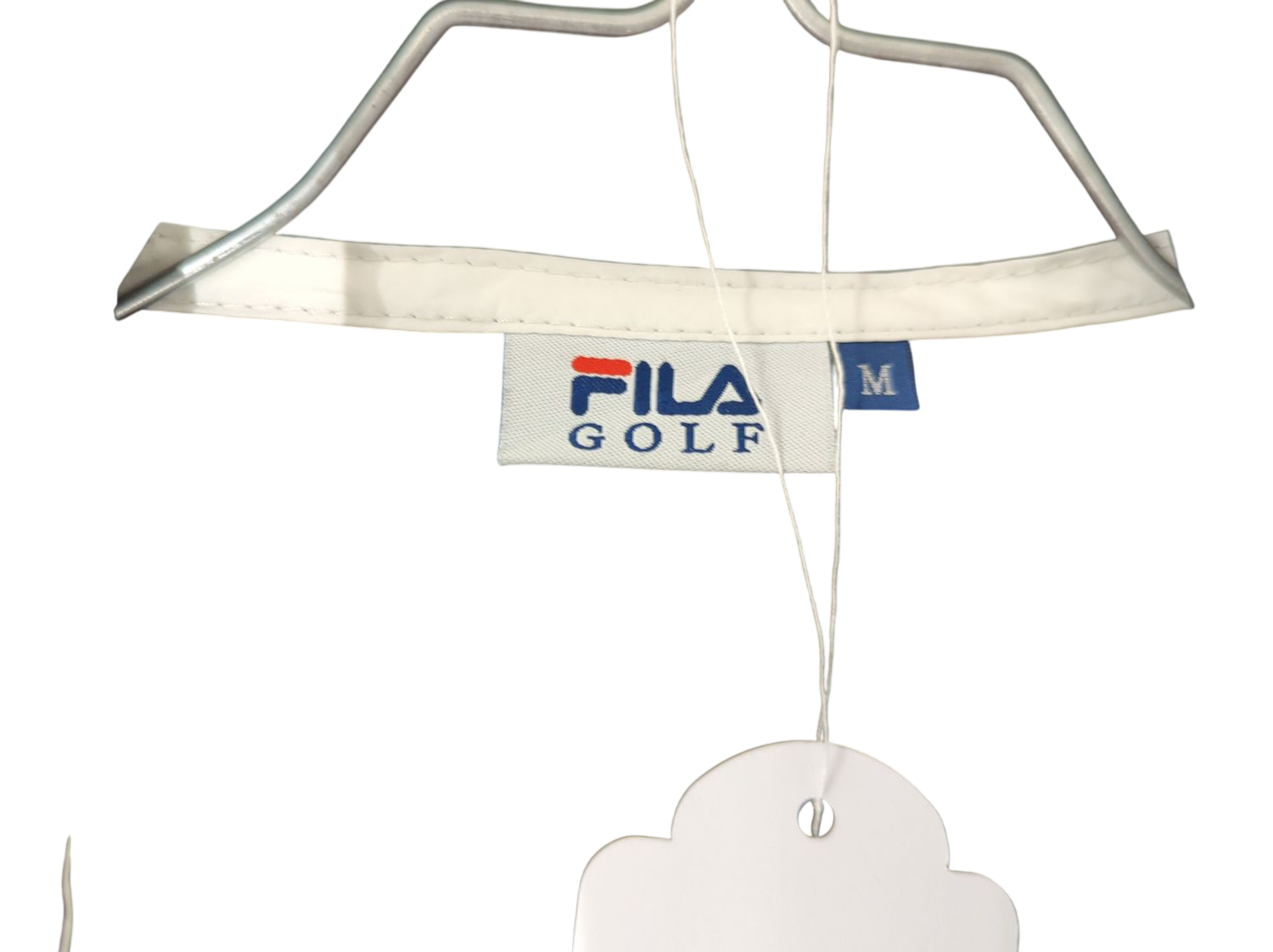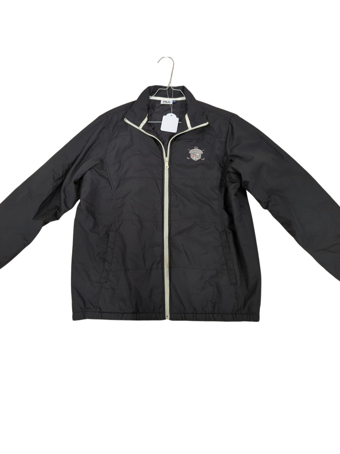Black FILA Golf windbreaker jacket featuring a distinctive 'Feel The Green' embroidered logo patch with golf club design on the chest. This lightweight jacket has a full front zipper with white piping detail along the collar and zipper line. Perfect for golf outings or casual wear, the jacket has a simple, athletic design with the signature FILA branding. The jacket shows some signs of wear but remains functional and stylish for any golf enthusiast.