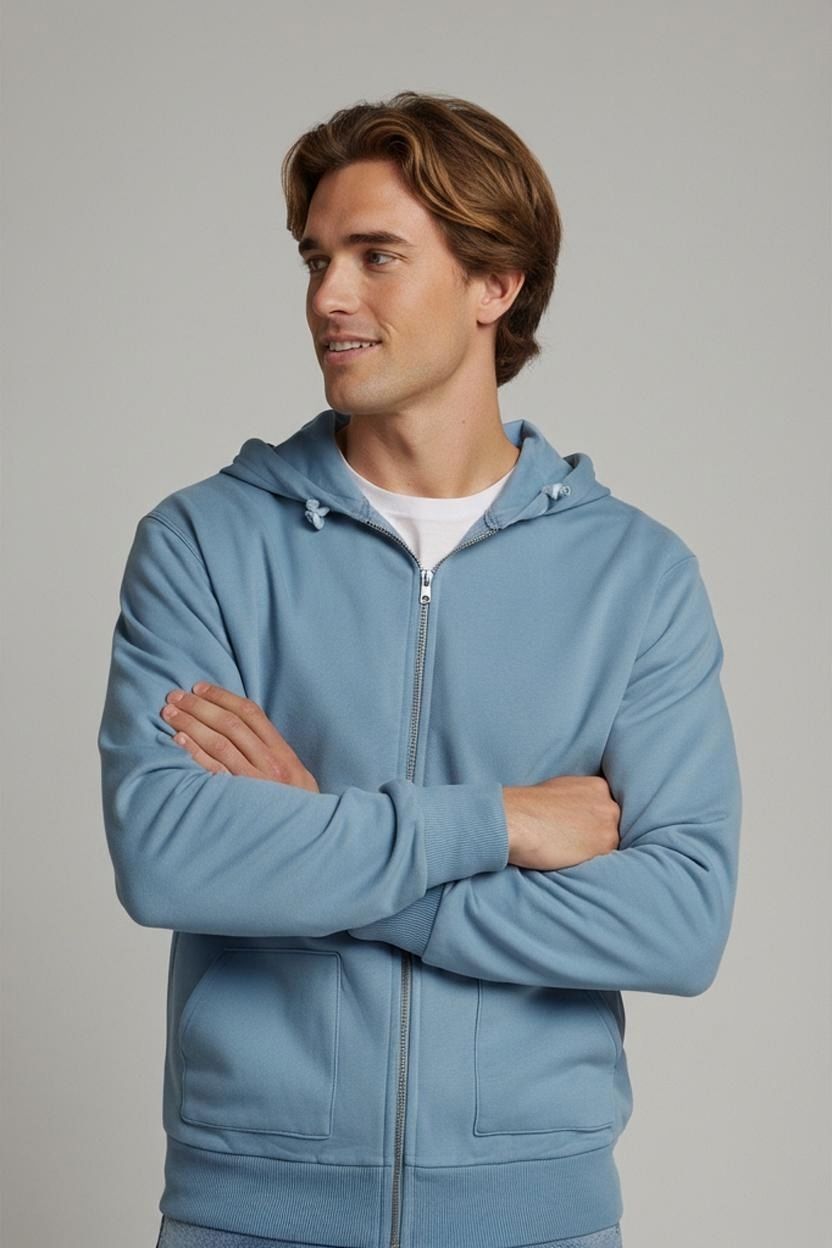G-Star RAW blue windbreaker jacket in men's size M. Features a full front zipper closure, ribbed cuffs and waistband for a comfortable fit. The jacket has practical front pockets and is made from a soft cotton blend material. The classic blue color makes it easy to pair with various outfits. Small G-Star RAW PRODUCT logo detail on the front. Shows signs of normal wear but remains in good used condition.
