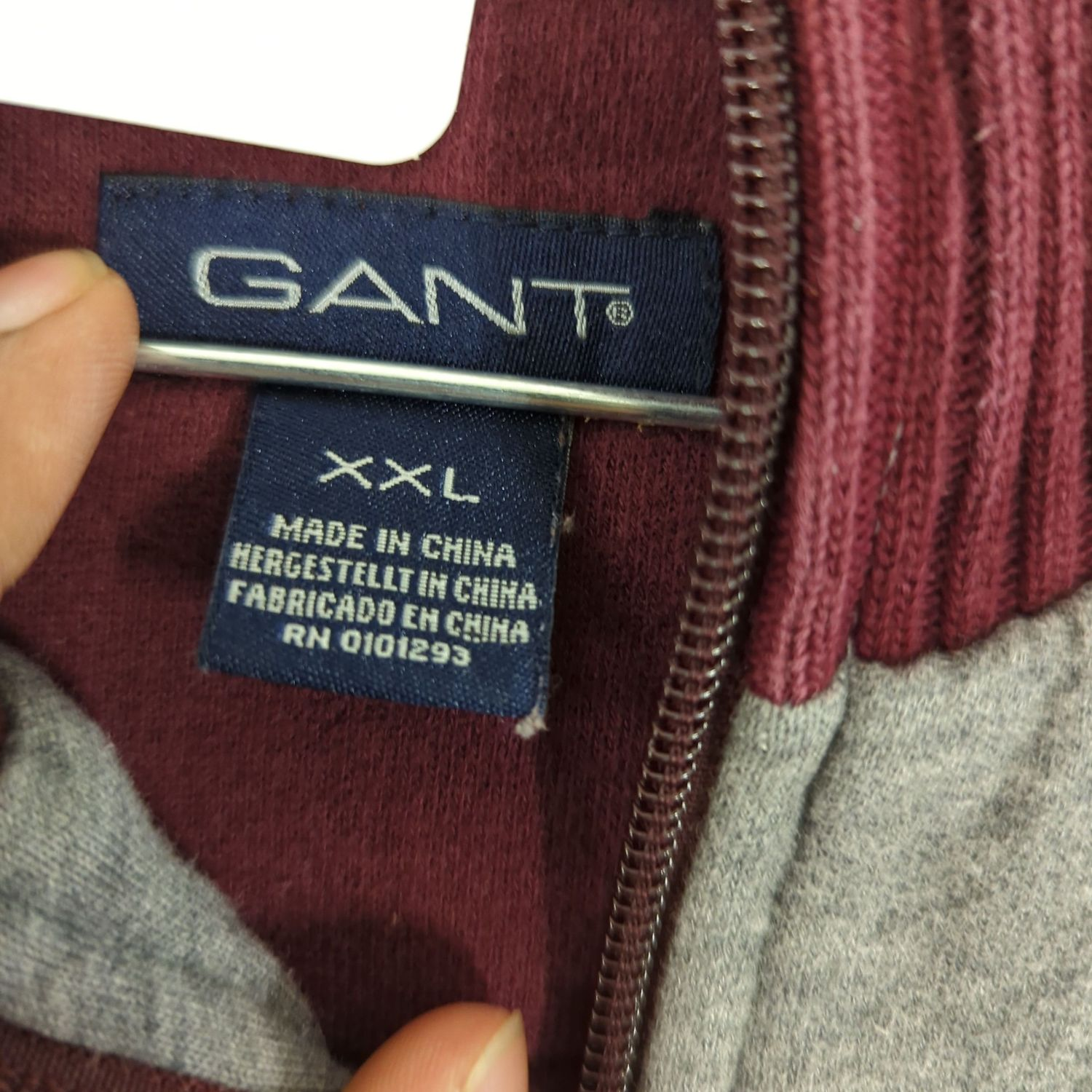 This GANT bomber jacket features a stylish burgundy and grey color combination with navy striped ribbed cuffs and collar. The jacket has a full front zipper closure and includes practical side pockets with zippers. The GANT logo is embroidered on the front. It's in size XXL and shows some signs of wear consistent with pre-owned condition. The jacket combines comfort with classic athletic-inspired styling, perfect for casual everyday wear.
