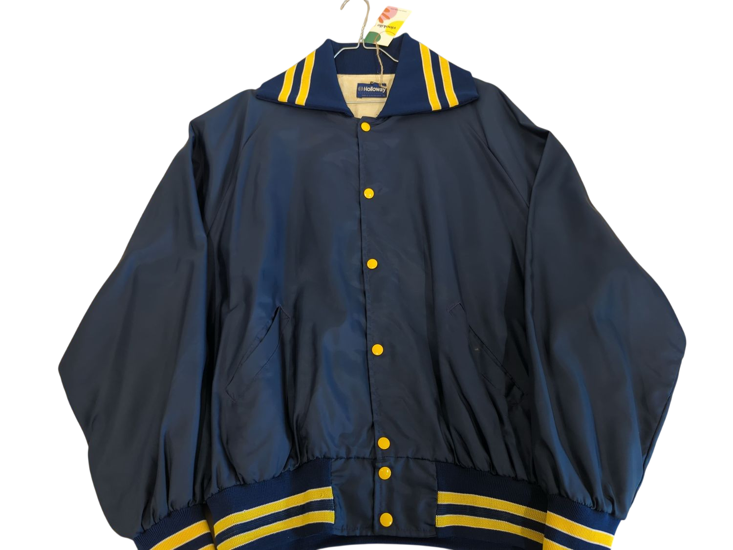 Holloway brand Augustana Vikings bomber jacket in navy blue with yellow accents. Features a snap button front closure with yellow buttons, ribbed collar, cuffs and waistband with yellow stripes. The back displays 'AUGUSTANA' across the shoulders and 'VIKINGS' on the waistband, both in yellow lettering. Made of nylon material with a classic bomber silhouette. Perfect for showing team spirit or casual wear. The jacket shows some signs of previous use but remains in wearable condition.