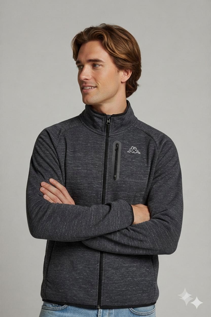 Men's Kappa windbreaker jacket in heathered grey. Features the iconic Kappa logo on the chest. Full zip front closure with a zip pocket on the right side. The jacket is size XL and has a comfortable athletic fit. Made from a lightweight polyester material, perfect for casual everyday wear or light physical activity. The jacket is in used condition but still has plenty of life left.