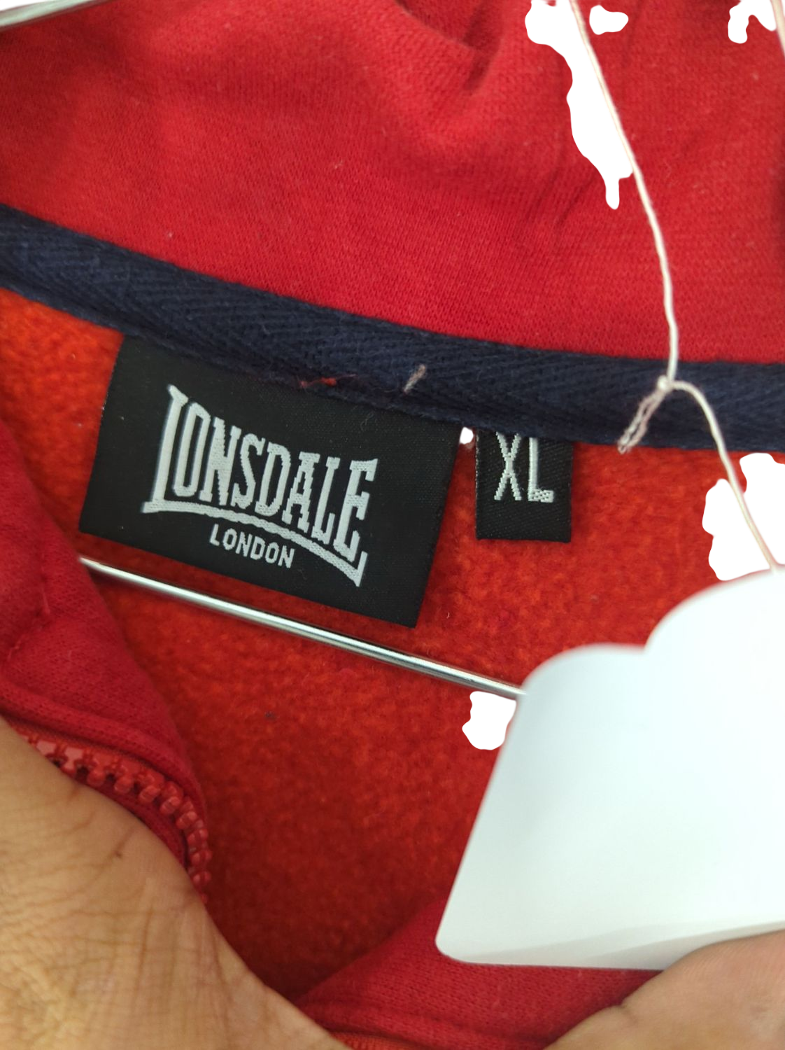 This is a red Lonsdale London zip-up jacket in size XL. The jacket features a long sleeve design with the Lonsdale logo on the front. Ideal for casual or sporty wear. Please note, care and material details are not visible from the tags shown.