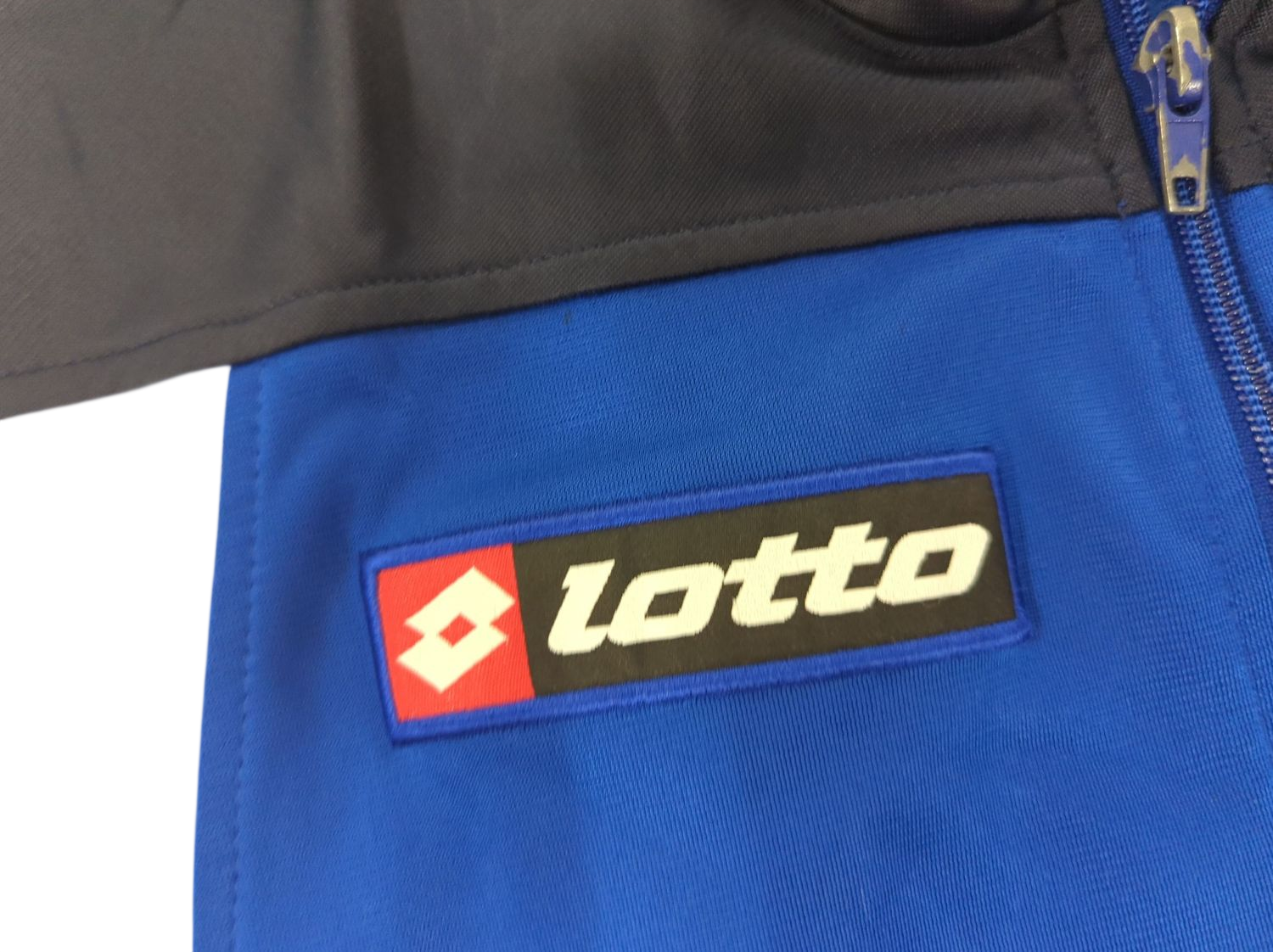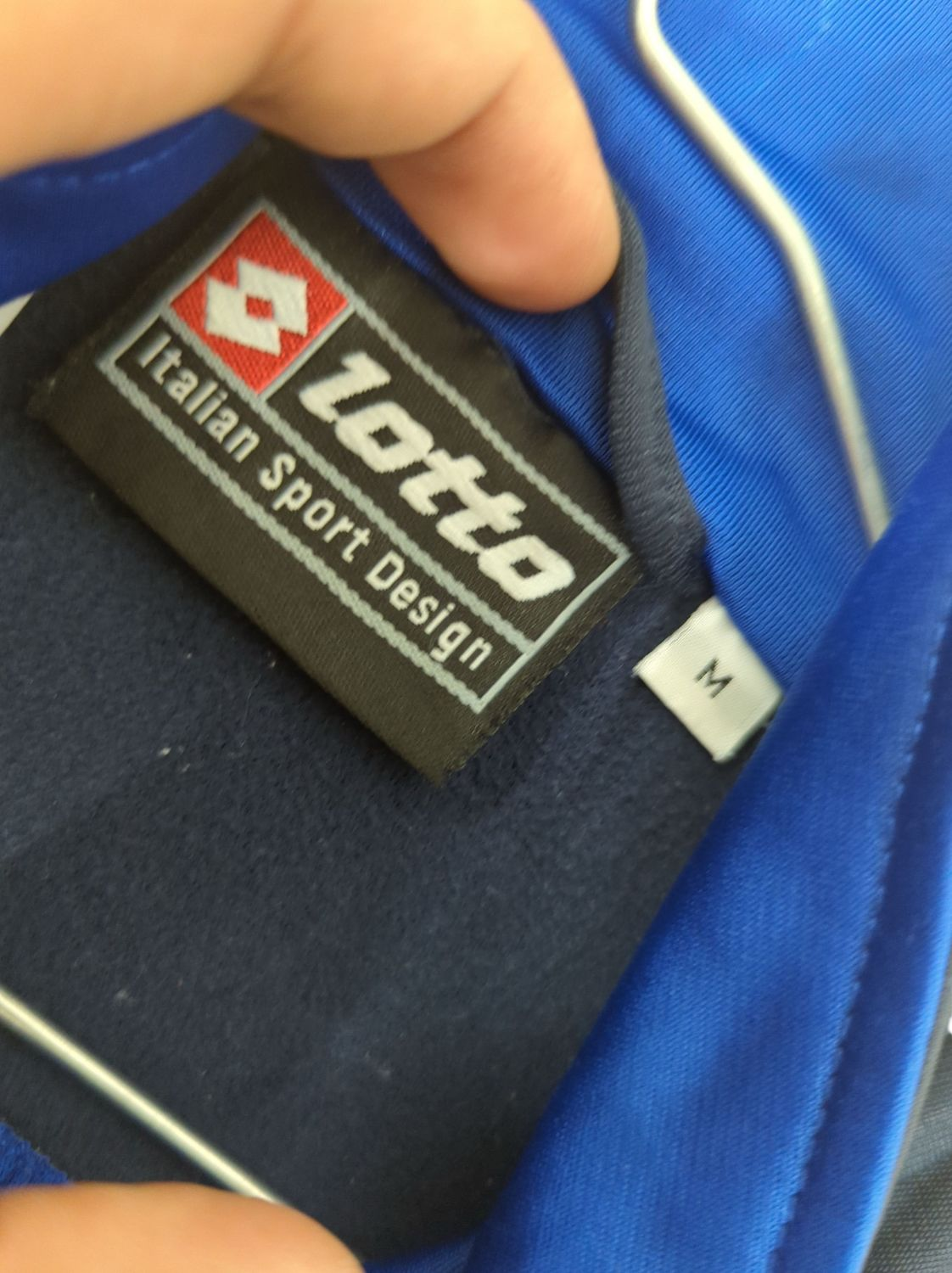 This Lotto windbreaker jacket features a striking blue, navy, and white color block design. The jacket has a full front zipper closure and a sporty look characteristic of the Lotto brand. It's sized as Medium (M) and appears to be in used condition. The jacket has a classic athletic style with contrasting navy sleeves and collar against the predominantly royal blue body. Perfect for casual wear or light outdoor activities. Please note that there may be signs of previous use consistent with a pre-owned item.