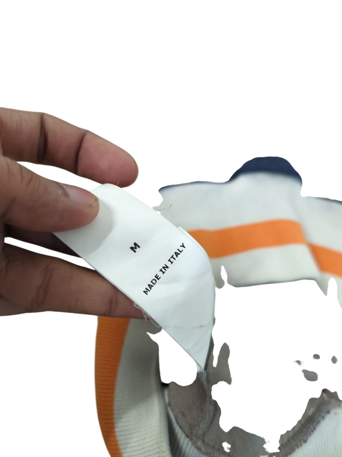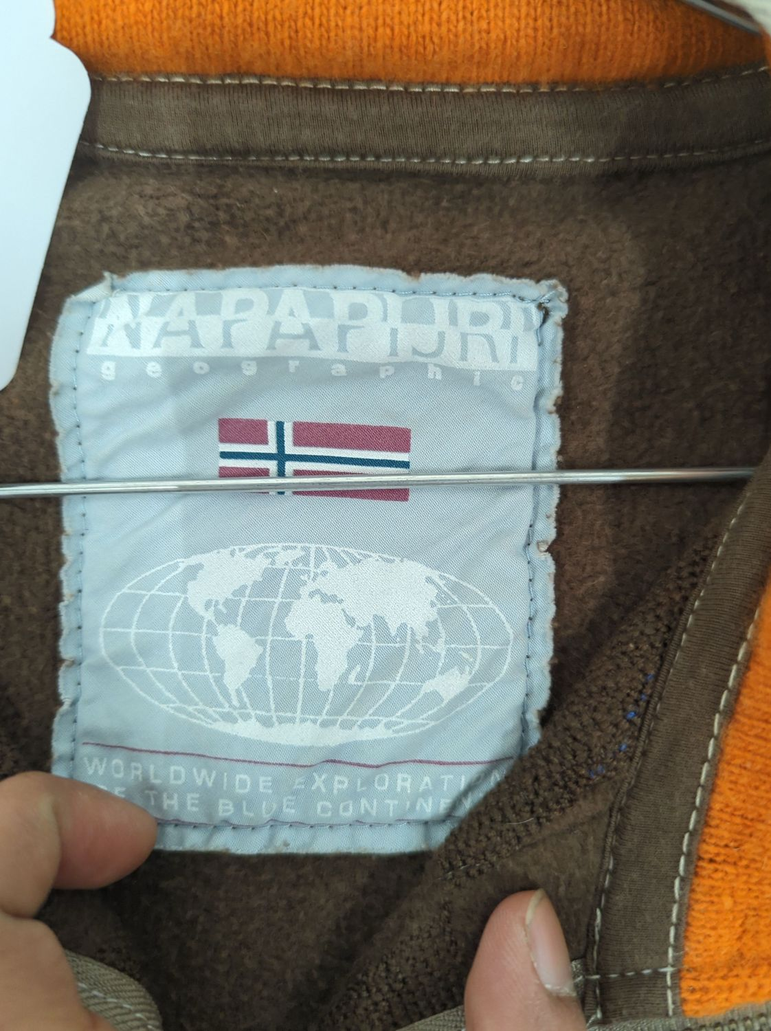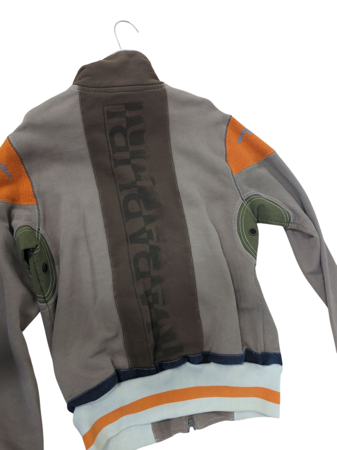 Napapijri men's zip-up jacket in size M. This casual jacket features a grey and brown body with distinctive orange shoulder patches and white/orange/navy striped cuffs. The jacket has the iconic Norwegian flag patch on the front and Napapijri branding across the chest. It includes practical design elements like shoulder reinforcements and appears to be well-constructed for everyday wear. Made in Italy, this is a versatile piece that combines sporty style with casual functionality.