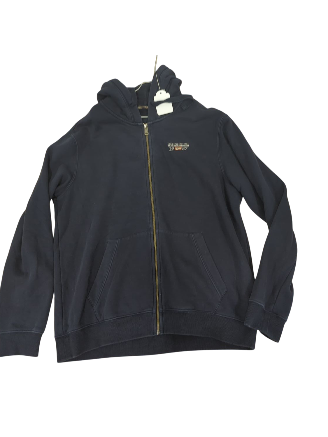 This Napapijri navy blue jacket features a full front zip closure with two side pockets. The jacket is in used condition and comes in size XXL. It has the distinctive Napapijri branding visible on the chest area. The jacket has a simple, casual design perfect for everyday wear. Made from what appears to be a cotton blend material with a soft interior. The collar has a classic design and the cuffs are elasticated for comfort.
