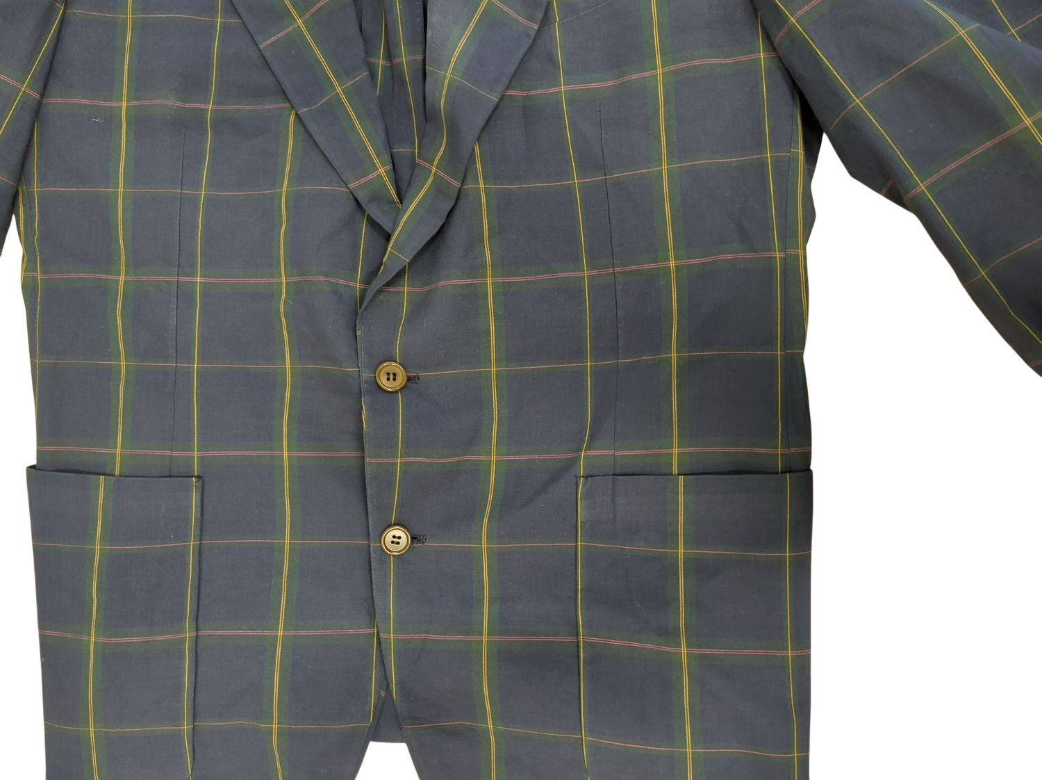 This is a navy blue plaid blazer featuring a distinctive check pattern with green and yellow lines and subtle red accents. The jacket has a classic cut with two front buttons, flap pockets, and a notched lapel. Fully lined in navy fabric for comfort and structure. The blazer shows some signs of wear consistent with its used condition. It would make a versatile addition to a professional or smart casual wardrobe. Please note that the size information is not visible in the images.