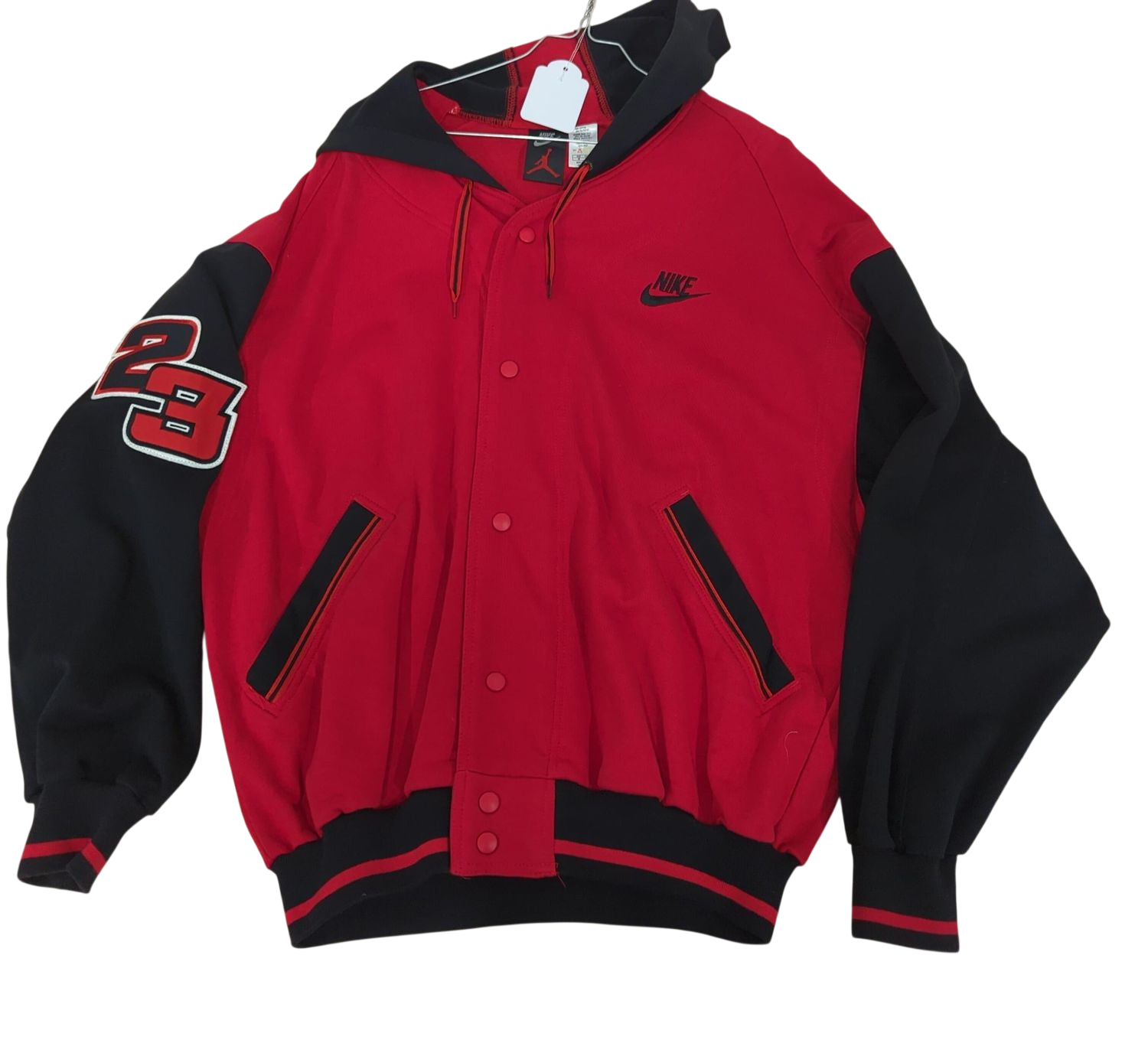 Red and black Nike Air Jordan bomber jacket in men's size L. Features the iconic Jordan jumpman logo and Nike swoosh on the chest. The jacket has black sleeves with the number 23 on one sleeve, contrasting with the bright red body. Includes multiple front pockets with zipper closures and snap button front closure. Made from cotton material with ribbed cuffs and collar. Great for sports enthusiasts and streetwear fans alike.