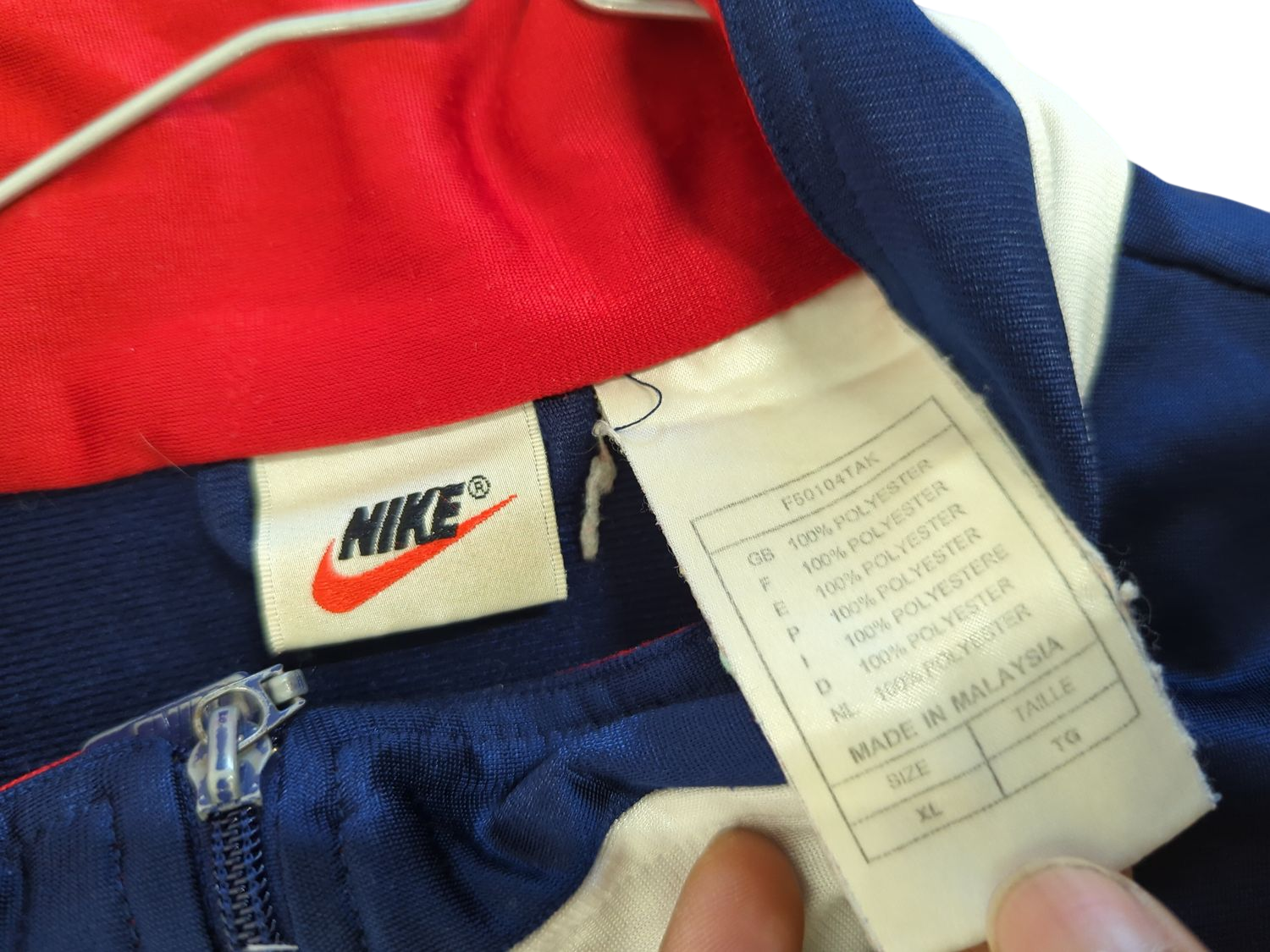 Vintage Nike windbreaker jacket in navy blue, red, and white colorblock design. Size XL, made from 100% polyester material. Features a full front zipper, ribbed collar and cuffs, and the iconic Nike logo on the chest. The jacket has side pockets and Nike branding on the sleeve. This classic sportswear piece combines style and functionality, perfect for casual wear or light athletic activities. Made in Malaysia. Please note this is a pre-owned item with normal signs of wear.