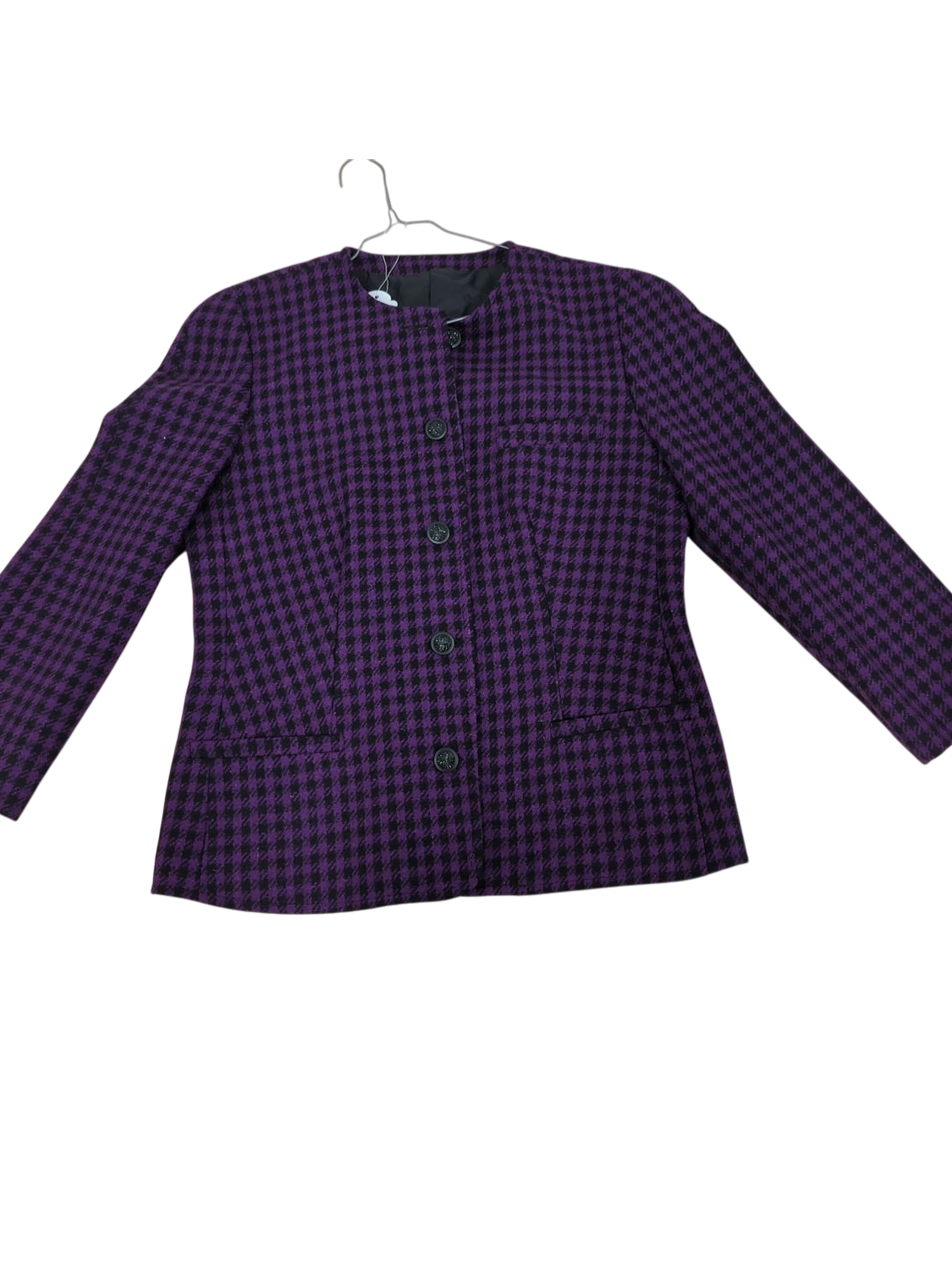 This purple and black checkered jacket features a classic houndstooth pattern. The jacket has long sleeves, a button-up front closure with approximately five buttons, and appears to be structured in design. According to the size tag, it's a European size 44 (GB 14). The lining appears to be in a dark gray color. This versatile piece would work well for both office wear and more formal occasions.