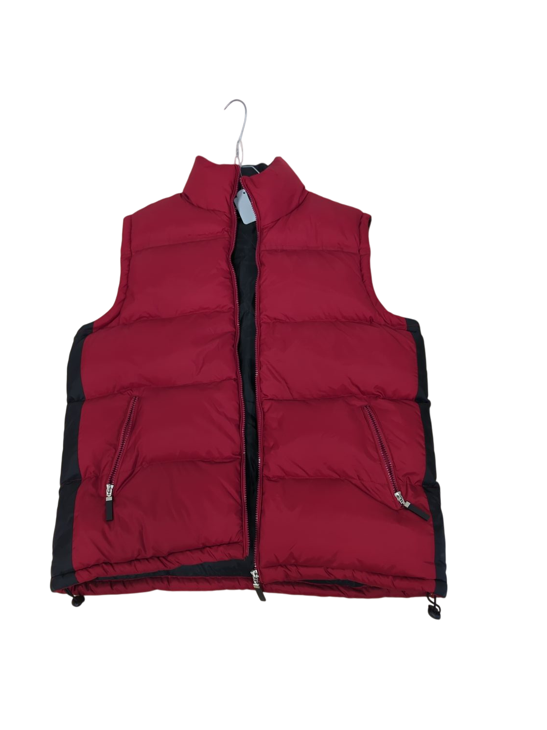 This pre-owned Sprayground down puffer vest features a vibrant red exterior with black trim. The sleeveless design has a full front zipper closure and side zipper pockets for functionality. The quilted construction provides warmth while maintaining a lightweight feel. Size L. Perfect for layering in cooler weather or as a statement piece for casual outfits.