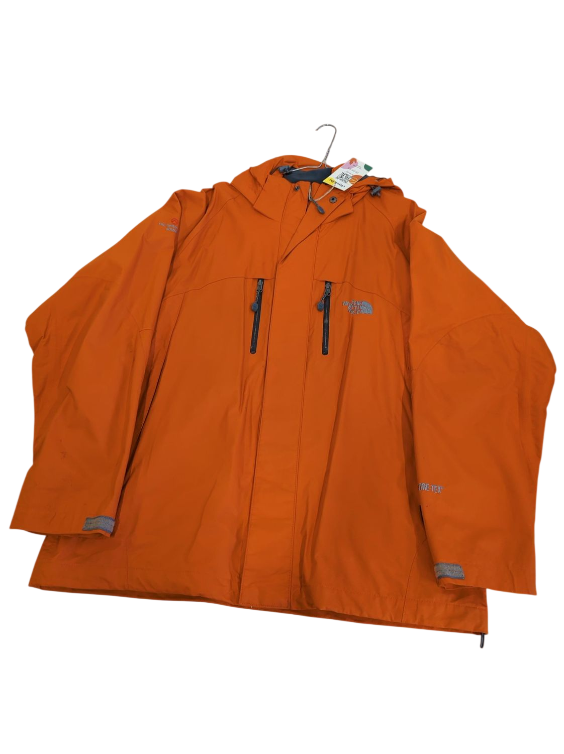 This is a pre-owned The North Face Summit Series jacket in bright orange. The jacket is size XL/TG and features a hood, front zipper closure, and two zippered chest pockets for secure storage. Made with waterproof technology, it offers protection against the elements while maintaining breathability. The North Face logo is embroidered on the chest and back. This versatile windbreaker is ideal for hiking, trekking, or everyday use in unpredictable weather. Shows normal signs of wear but remains functional and ready for your next outdoor adventure.