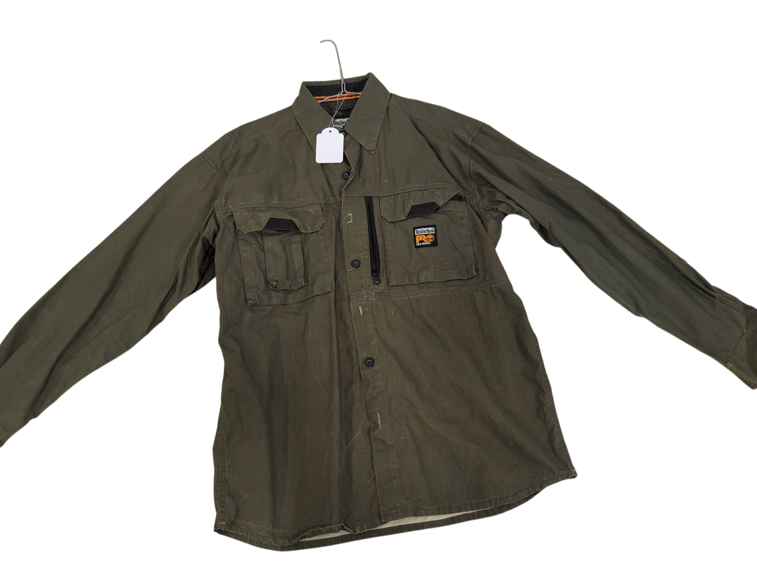 Timberland PRO Series work jacket in olive green. Men's size Medium. Features multiple functional pockets including chest pockets with the Timberland PRO Series logo patch. The jacket has a button-up front with a zippered pocket on the chest. Made of durable cotton material designed for work environments. Shows signs of normal wear but remains in good usable condition. Perfect for outdoor work or casual everyday wear.