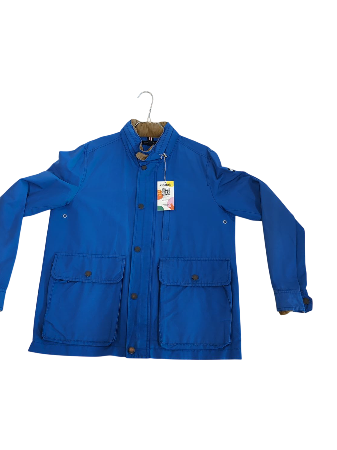 This Tommy Hilfiger windbreaker jacket in a vibrant blue color features the iconic Tommy flag logo on the sleeve. The jacket has a button-up front closure with multiple utility pockets on the chest. It comes in size S/P and has a tan corduroy collar lining for added style and comfort. The jacket is designed with a classic fit and practical details including adjustable cuffs. Perfect for casual everyday wear or light protection against wind and mild weather.