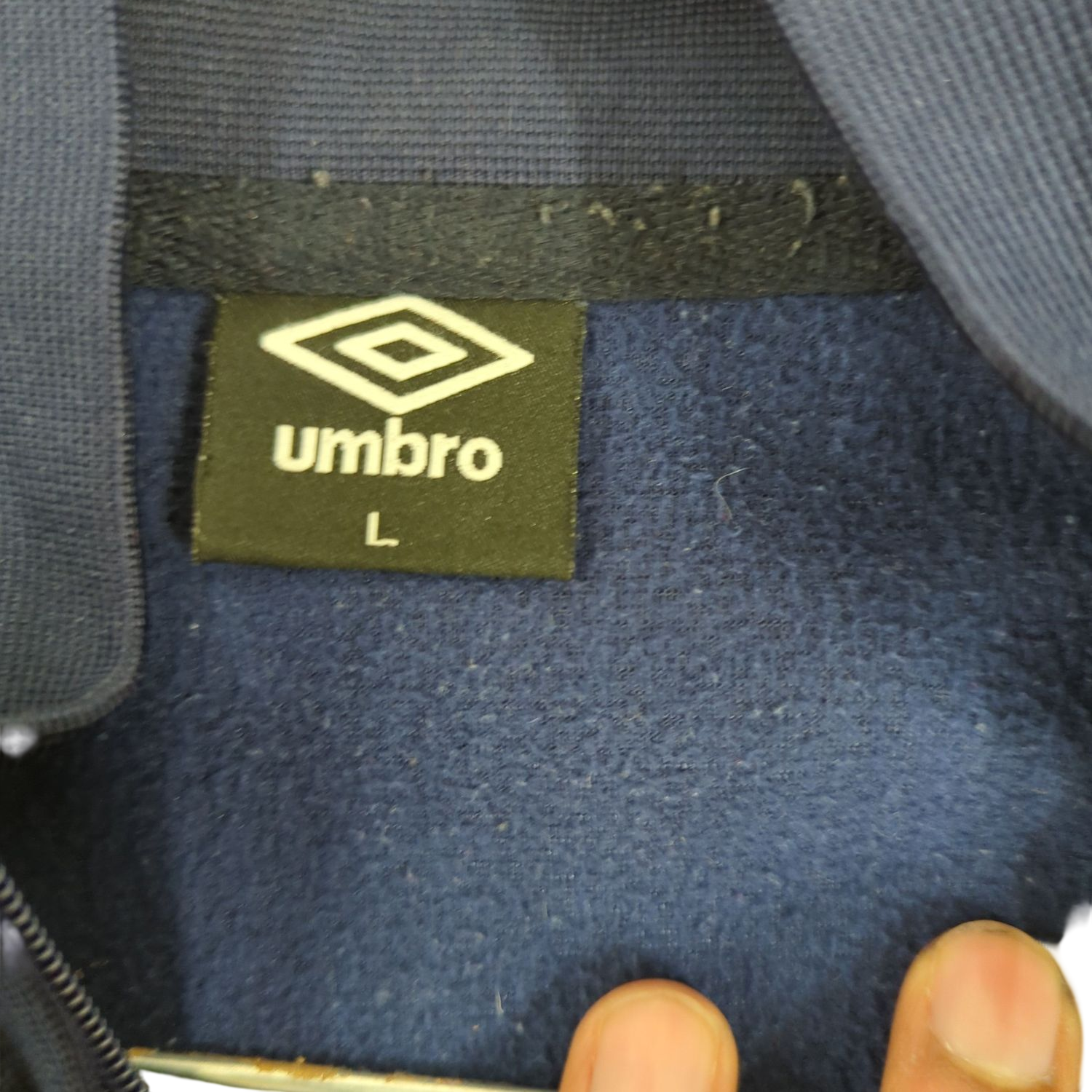 This is a navy blue Umbro windbreaker jacket in size L. The jacket features the iconic Umbro diamond logo on the chest and decorative diamond pattern trim along the sleeves. It has a full-length zipper closure and multiple zippered pockets for storage. Made from lightweight polyester material, this jacket is perfect for sports activities or casual wear. The classic navy color with subtle design elements makes it a versatile addition to any active wardrobe. Shows some signs of previous use but remains in wearable condition.