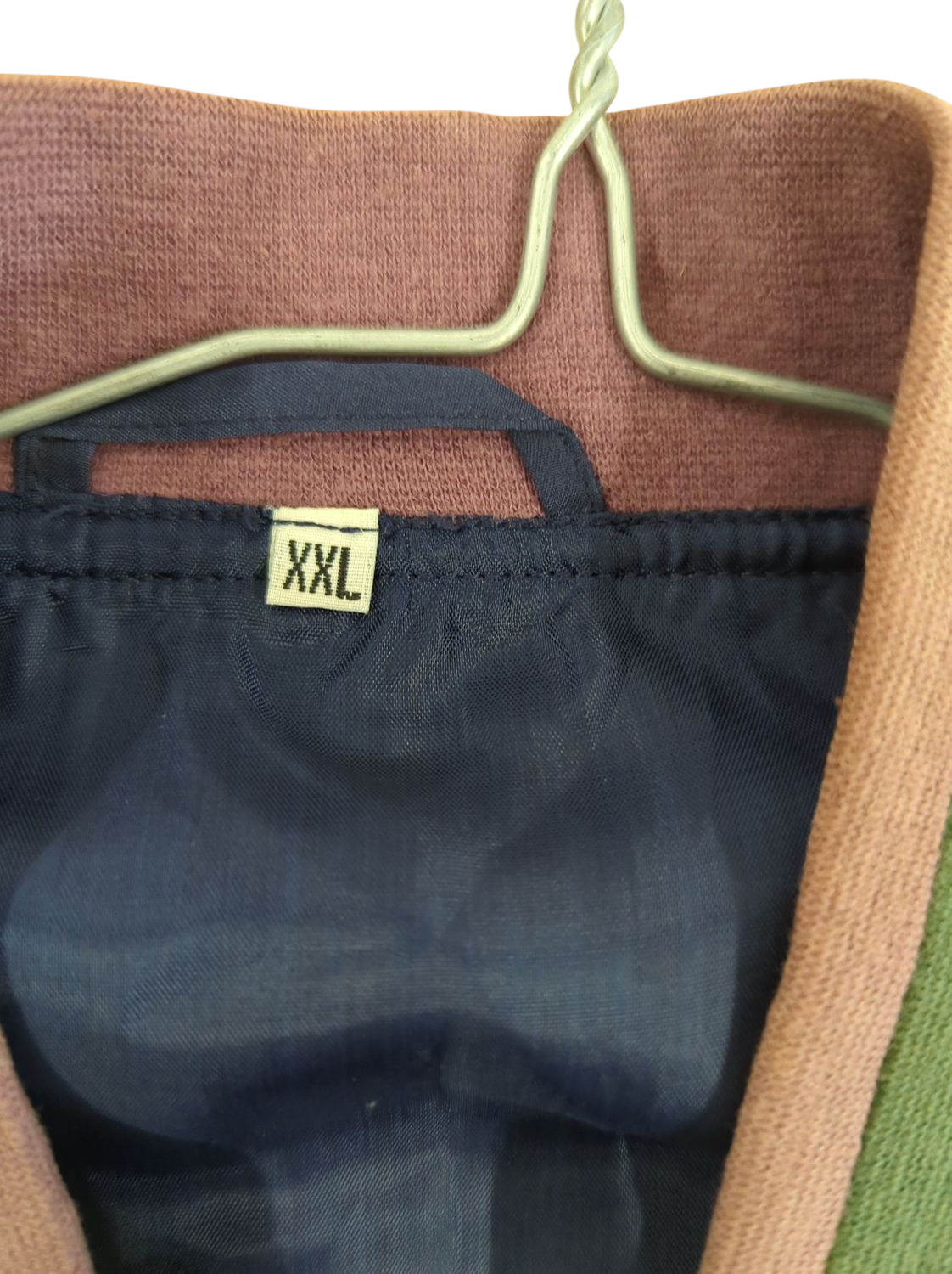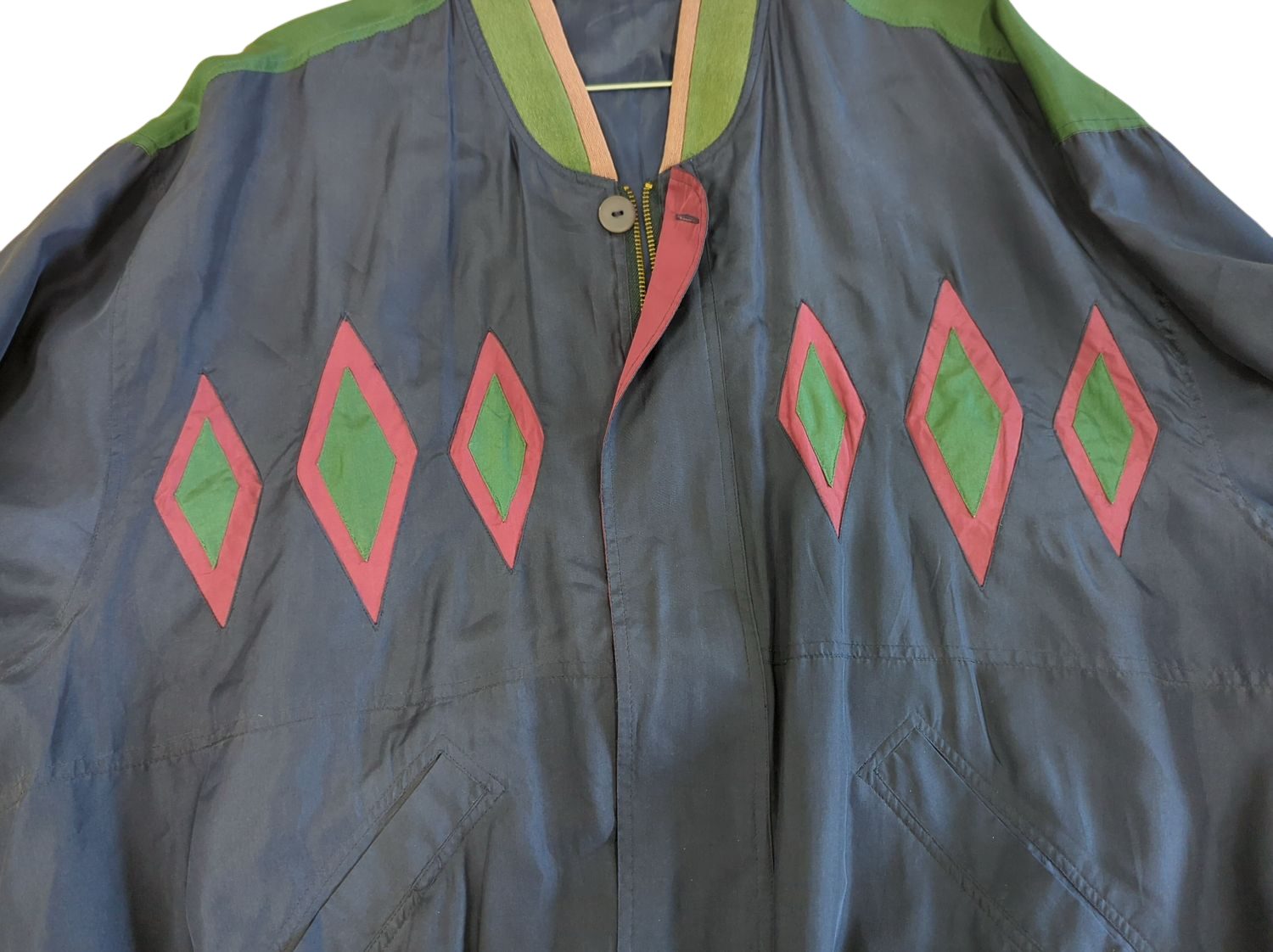 This vintage bomber jacket features a unique design with diamond-shaped patterns in green with pink borders across the front. The jacket has a navy blue base color with green trim along the collar and bottom hem. It includes button closures at the front and elastic cuffs at the sleeves for a comfortable fit. The size tag indicates XXL. This distinctive piece shows some signs of normal wear consistent with its vintage nature but remains in good used condition. The bold geometric pattern makes it a standout casual outerwear option.